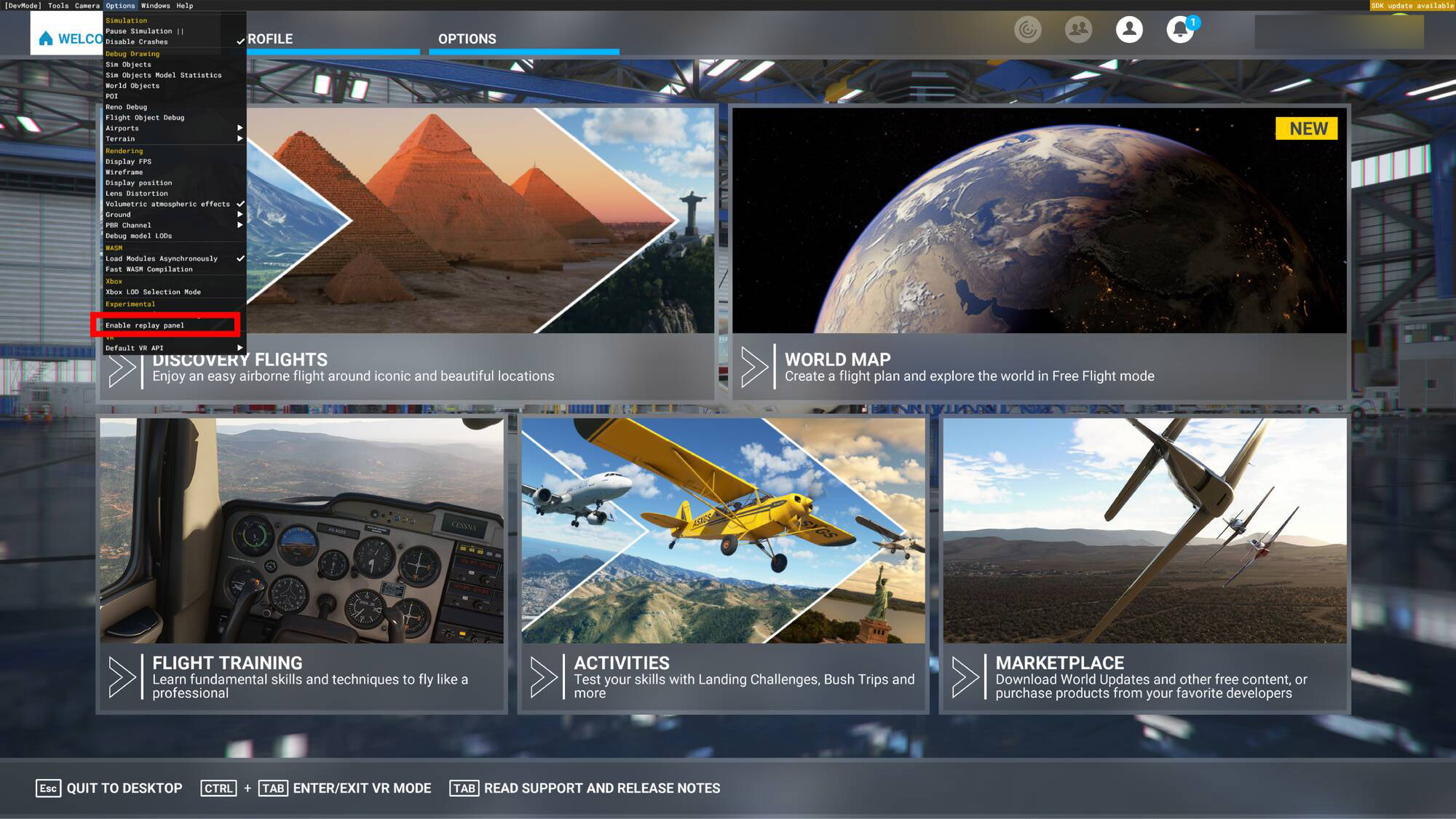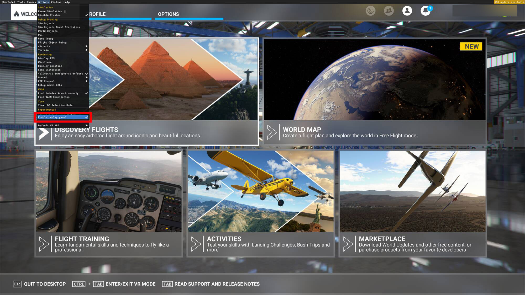 As an experimental feature in Flight Simulator the replay tool is not immediately accessible in the game. To use it, you’ll have to activate it first and to do so, some manipulations are needed.