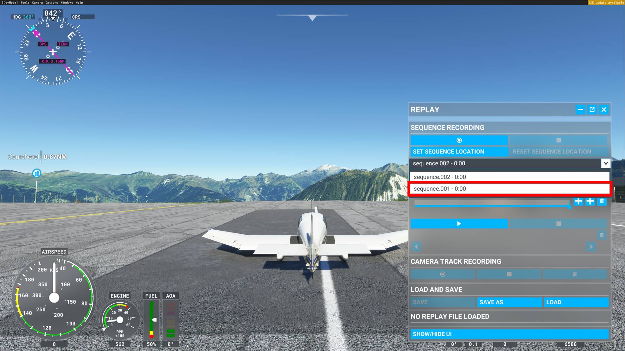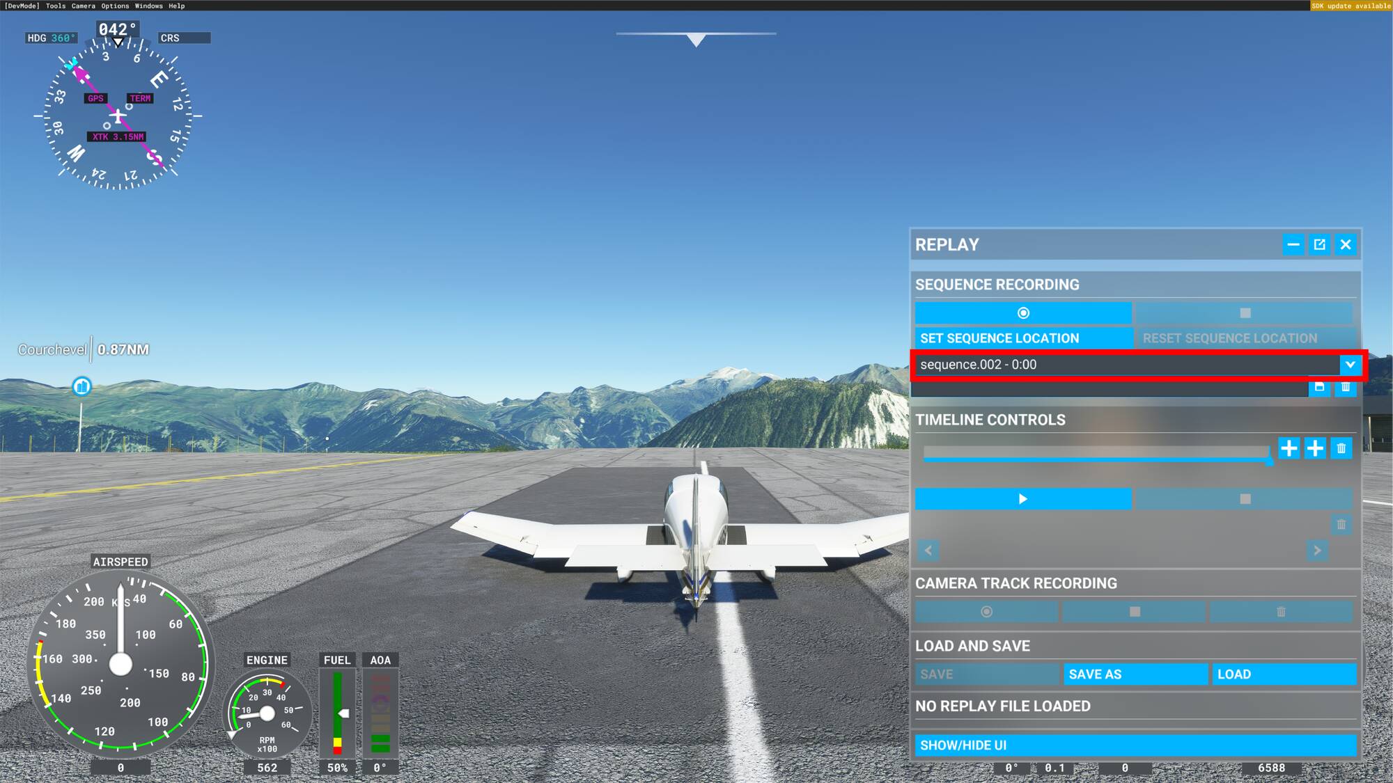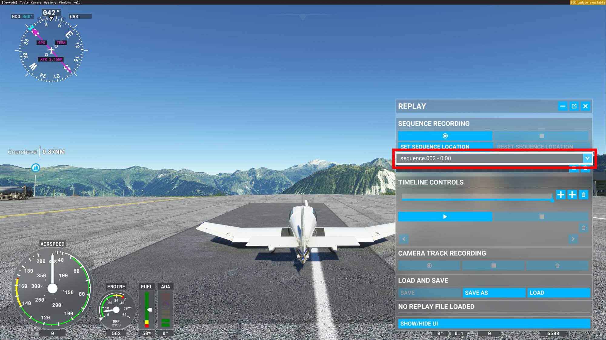 As previously stated, the sequence records your flight, your aircraft, and the camera used at the time, it does not take into account the geographic position of your aircraft. This means you can change the location during a recorded sequence.