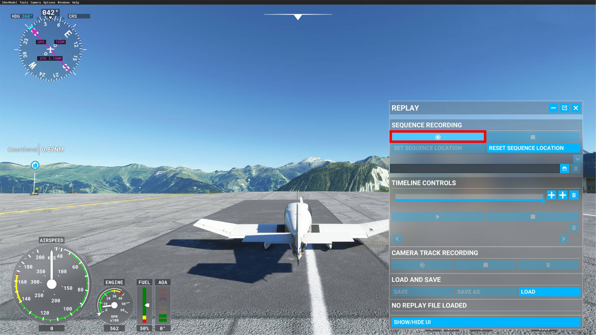 Once the Replay panel has appeared, the first thing you will have to do is to press the sequence recording button to start recording your flight.