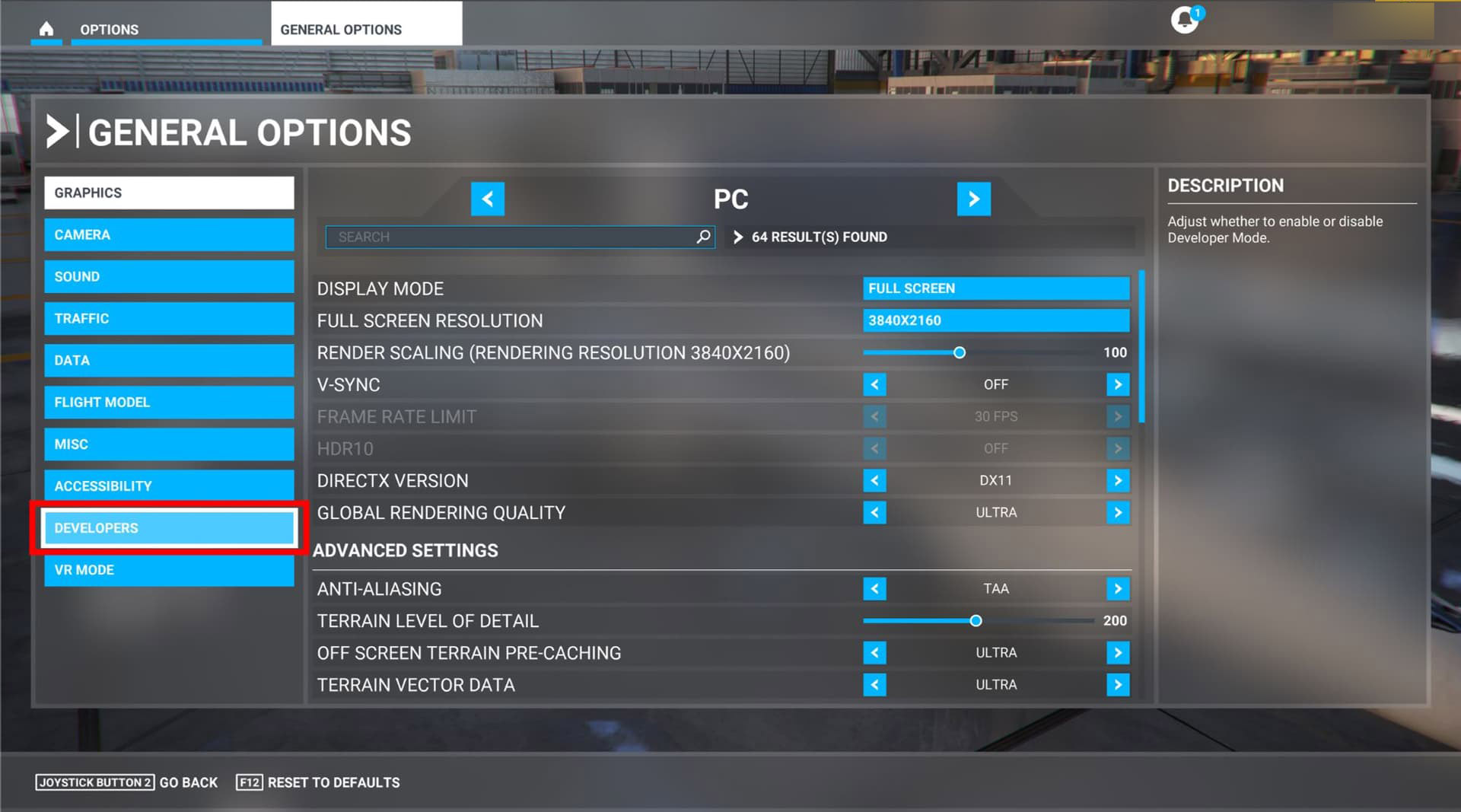 Now, before starting your flight session, click on the Options panel in the Developer mode toolbar