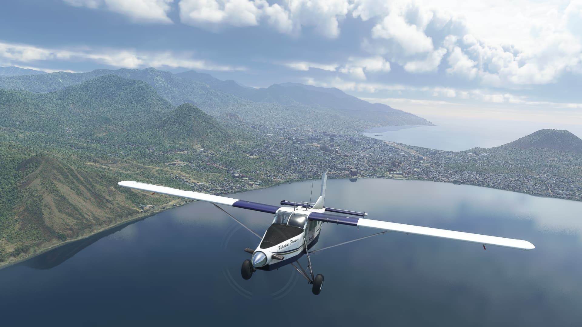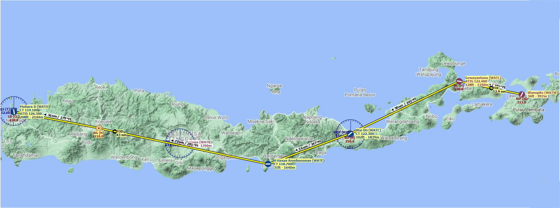 This journey westbound along the East Nusa Tenggara province of Indonesia island hops from Lembata over to Flores, and follows its volcanic spine for 221 nautical miles via several touch and go landings at Gewayantana (WATL), Maumere (WATC), and Ende (WATE). The volcanic topography is incredible, with decent resolution terrain mesh and Bing maps coverage for the flight path.