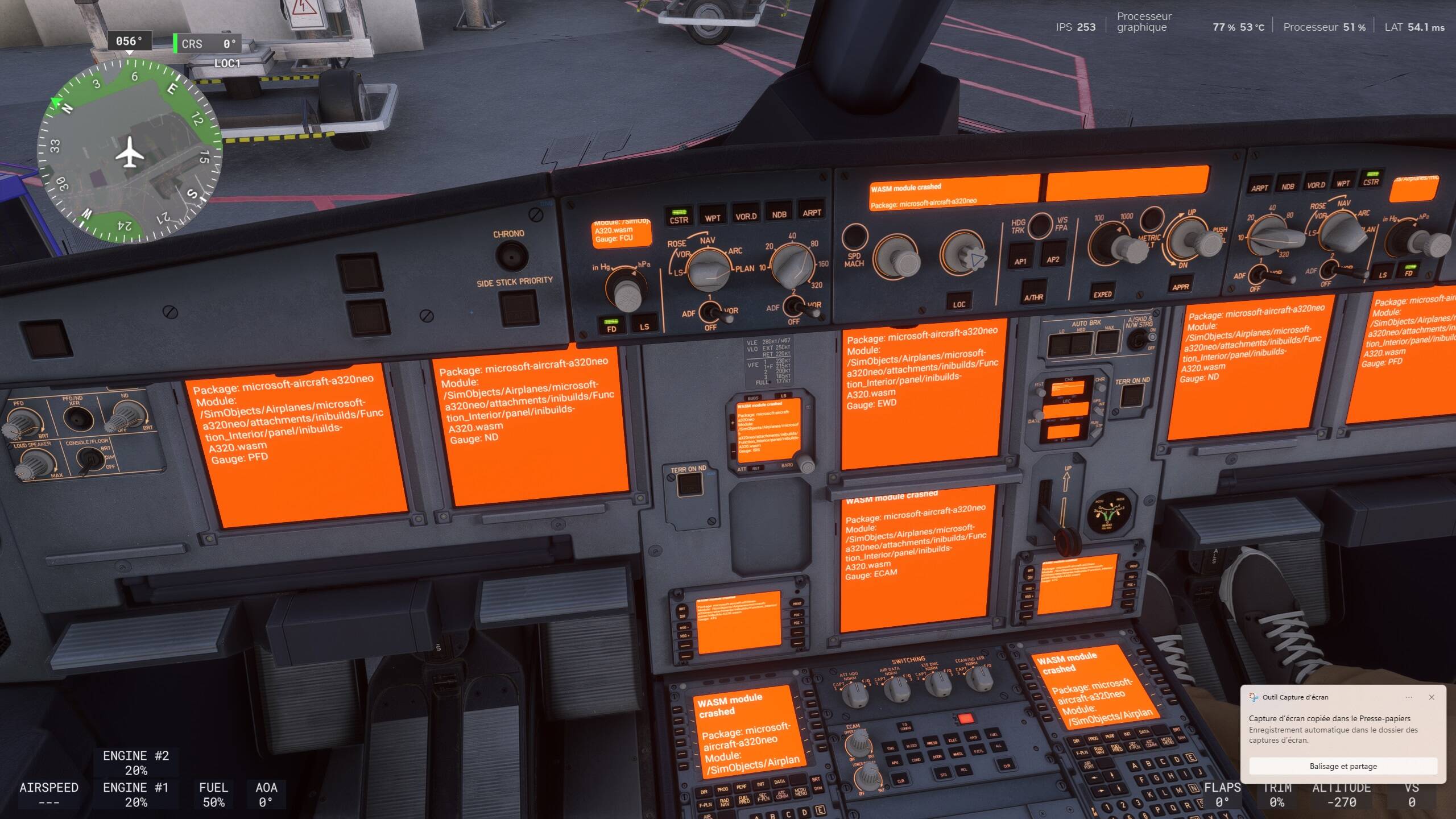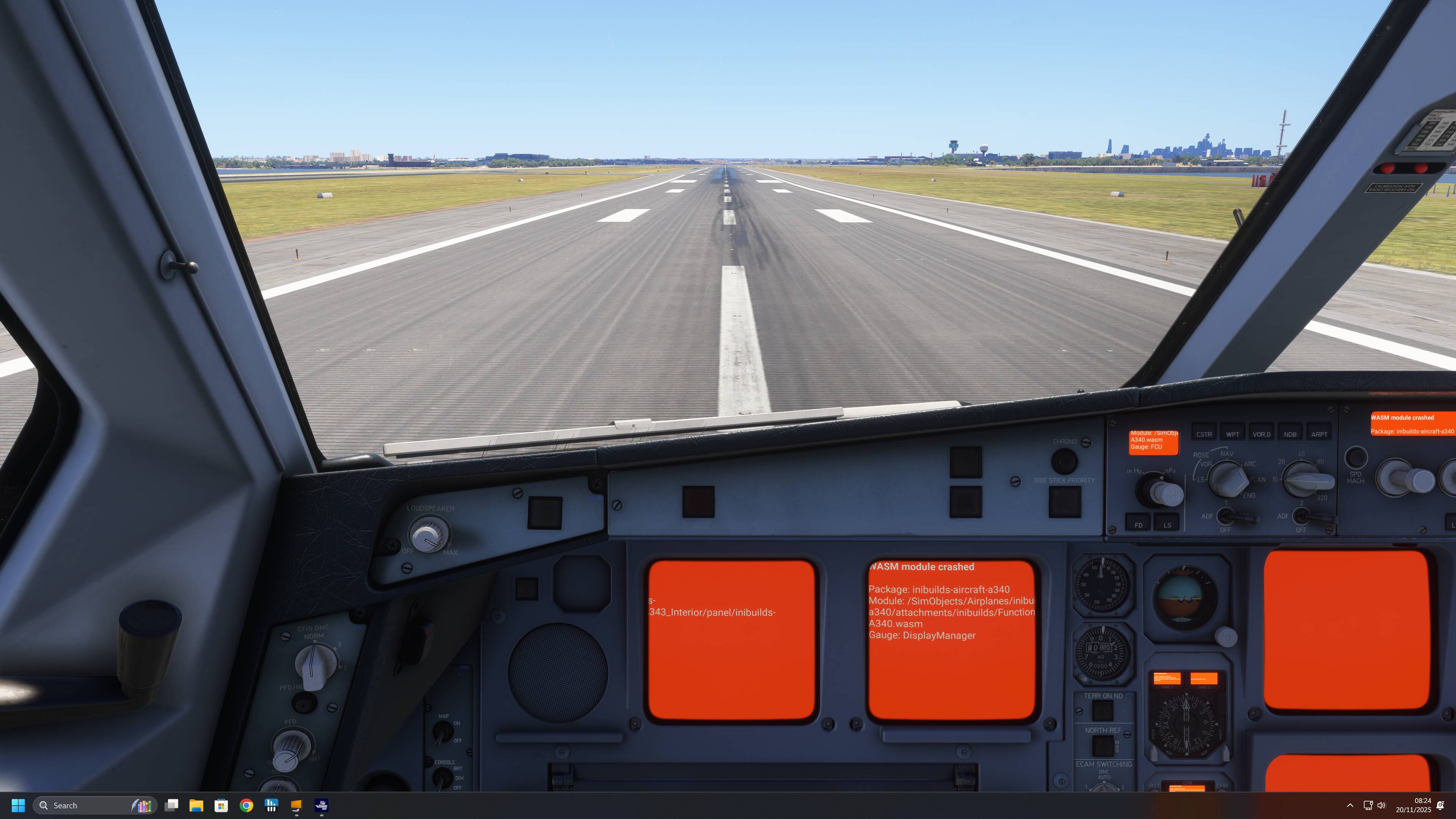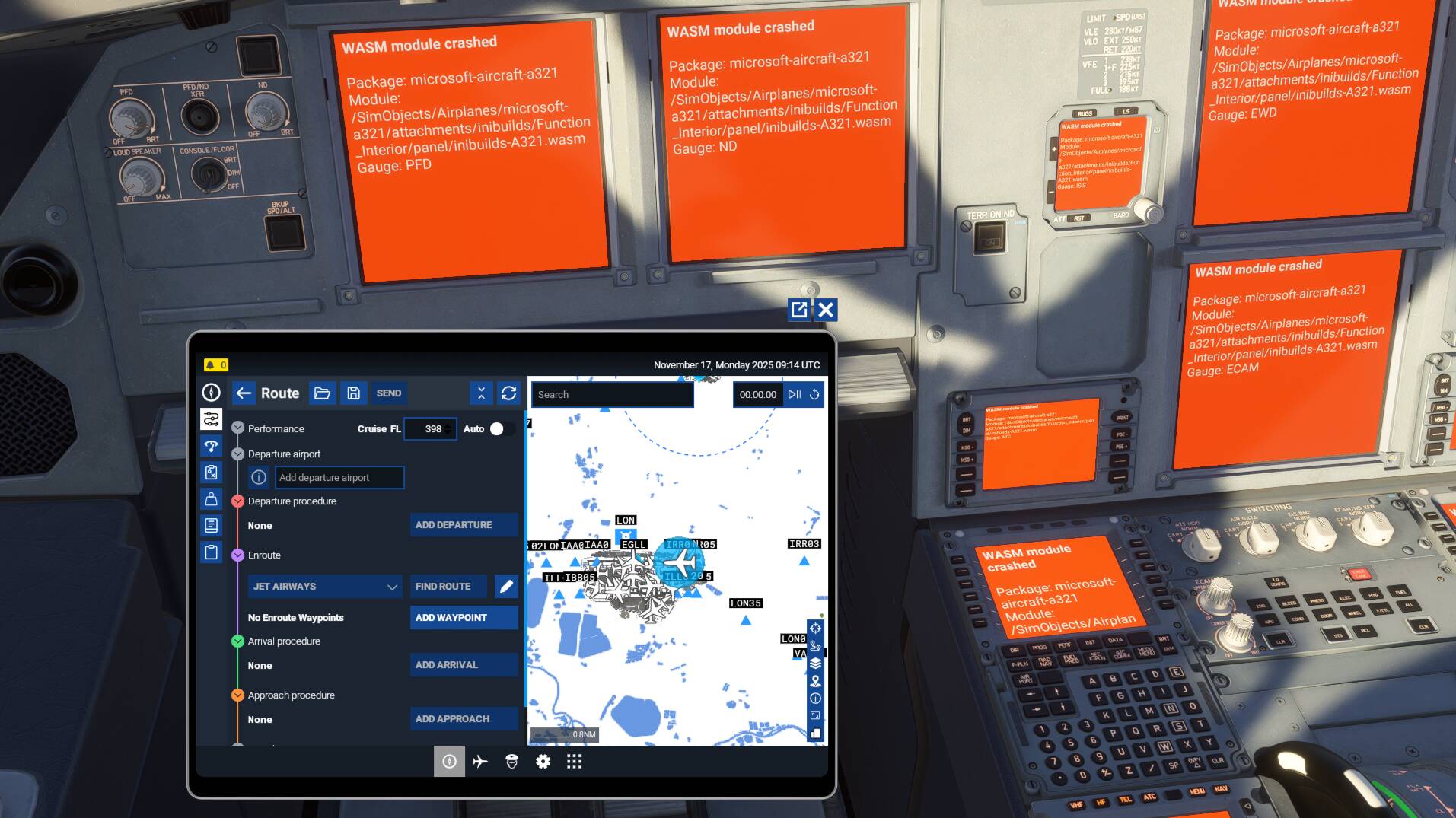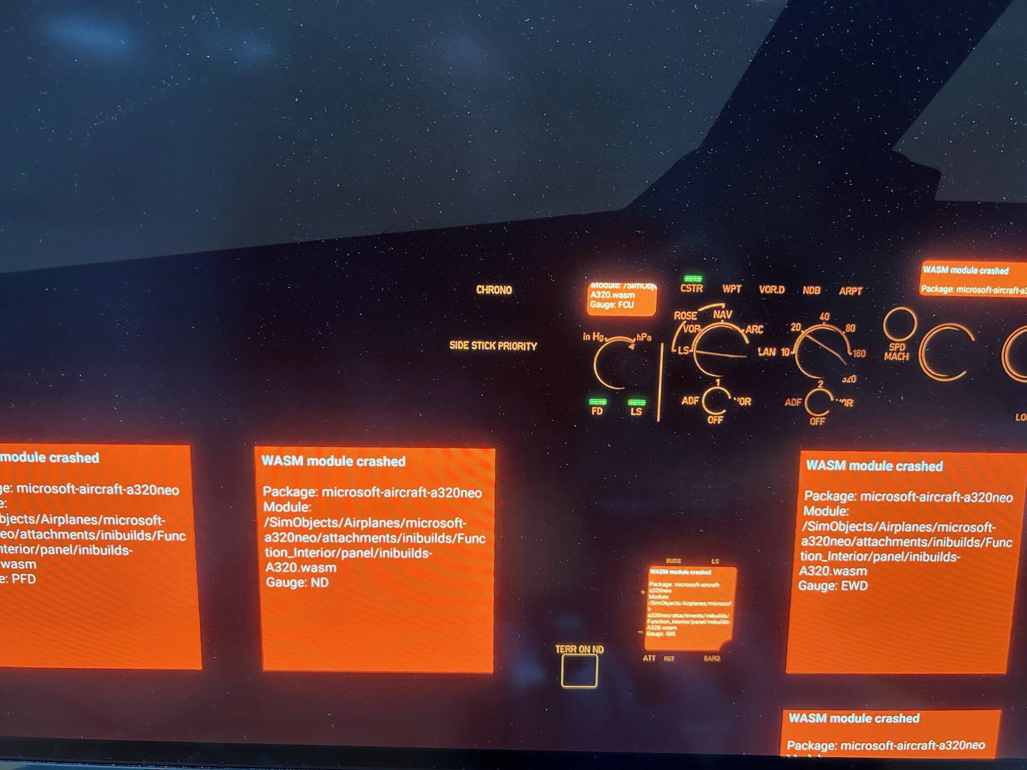 I created a flight plan from KPHX to KSAN and up until I was close to KSAN the flight was going well. But I overshot the airport and while attempting to make a âdirect-toâ to a previous waypoint and change the FCU speed and altitude, every cockpit display turned orange with a message âWASM module crashedâ