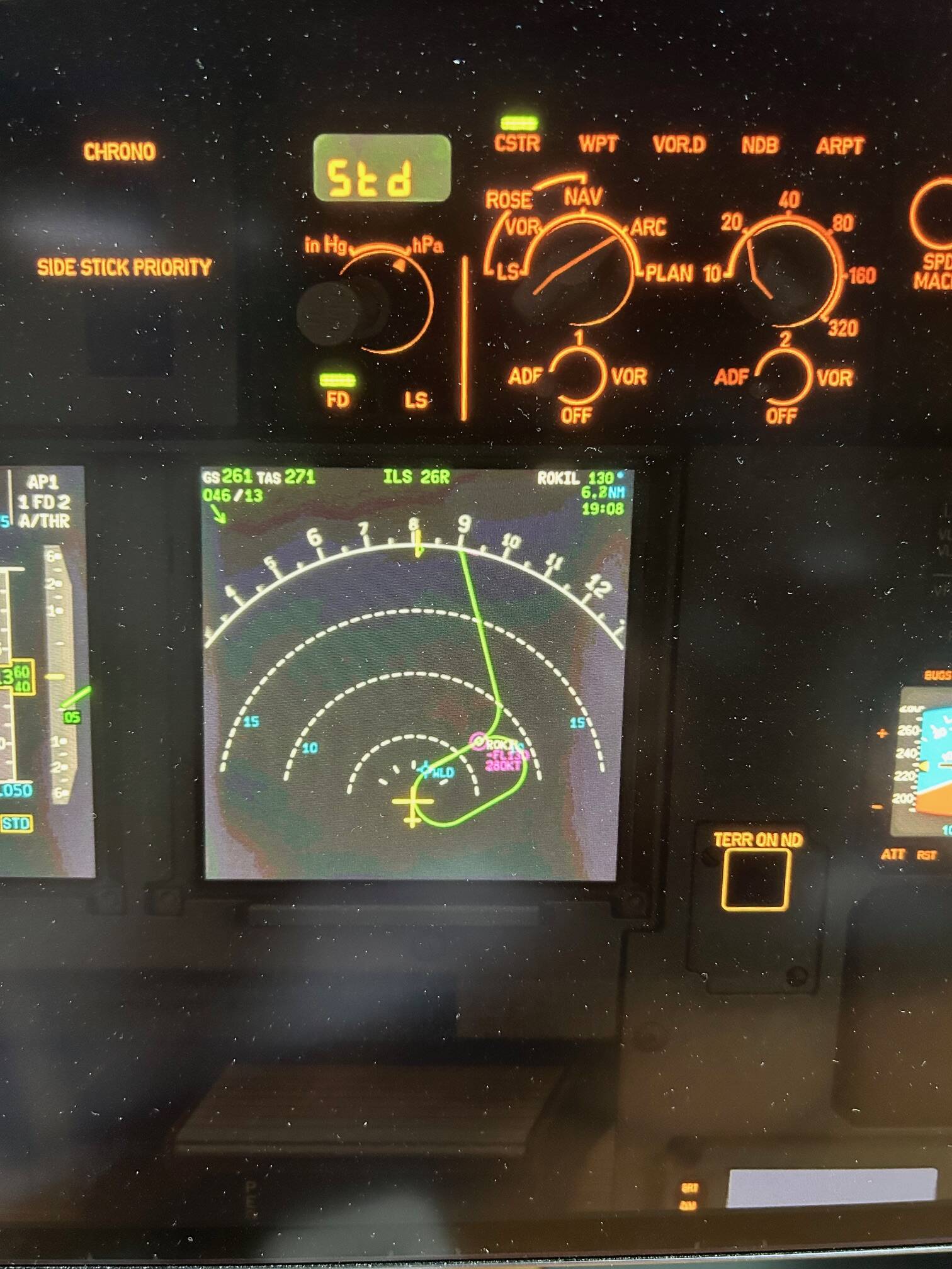 In the attached pictures you can see the PFD with the Hold-pattern, the MCDU after I left the Holding pattern and the error message on the different displays in the cockpit.
