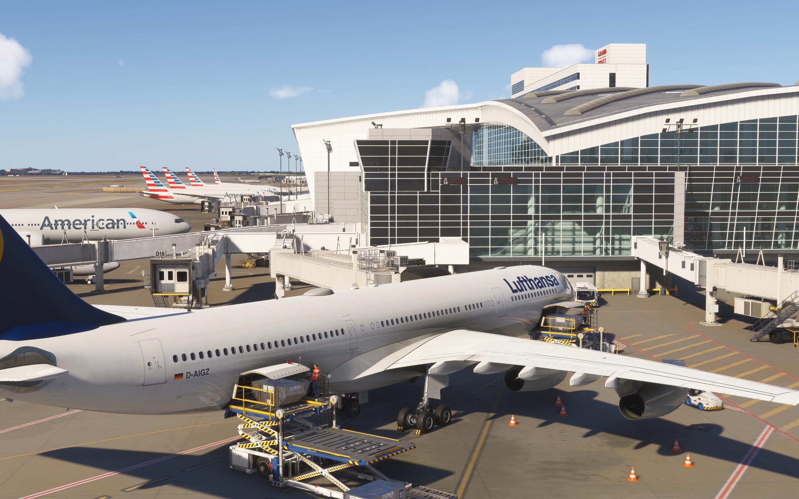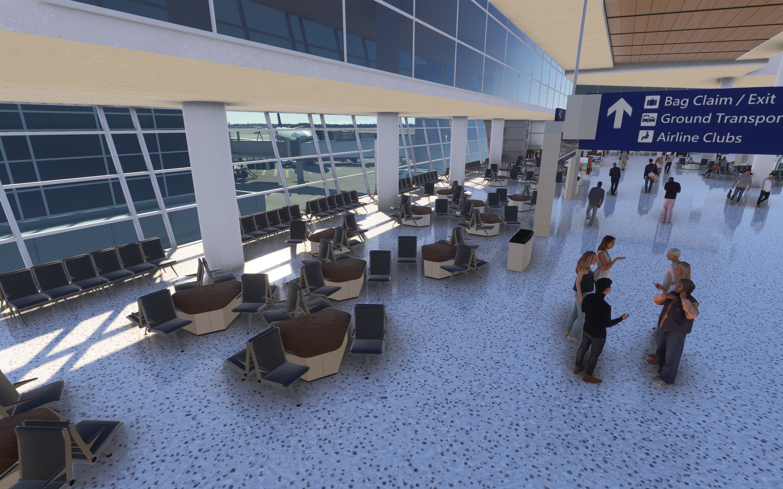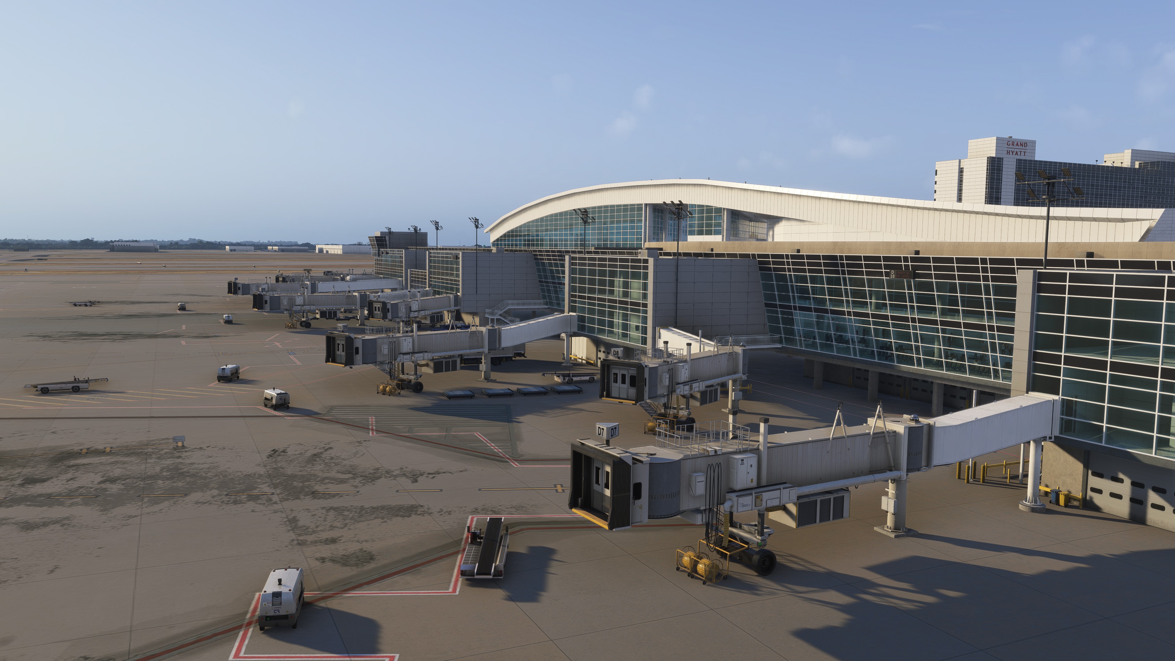 That’s true, but less so in the case of KDFW. Only about 20 percent of KDFW’s terminals have an interior. Large parts have parallax effects or black fronts. At night, the glass fronts are just black. That’s why I prefer the approach taken by WF Scenery for large hubs, which is to show a rudimentary interior in all terminals instead of a single detailed terminal and nothing at all in the rest of the airport. But as always, that’s a matter of taste.