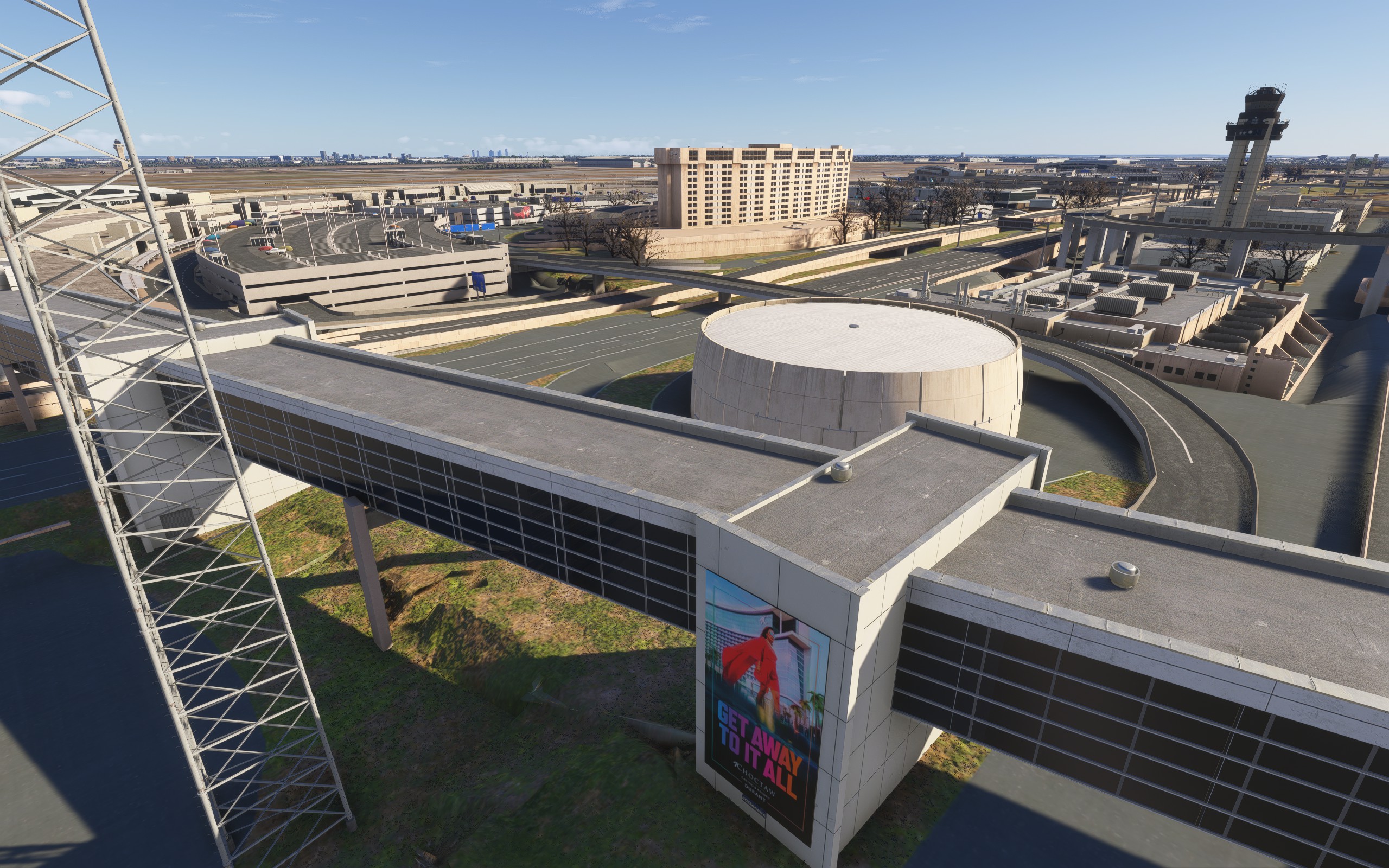 To be honest, the first impression is not that great, mainly due to the performance, but also because of the lack of detail. The airport is huge, no question about it. And it is surrounded by high-resolution photogrammetry. But considering that most terminals have parallax or only black surfaces as windows (without night lighting), the airport seems poorly optimised to me. As is usual with Inibuilds, you see many objects popping up at very short distances during the landing. Building textures are also rather low-resolution and the landside is kept very simple. All of this would be okay for me at such a large airport if the performance were good. But with my RTX 4090 and 7800x3d, it stuttered significantly on the runway and taxiway with the PMDG 737. The comparison with Rome V2 is certainly a bit flawed because KDFW is significantly larger. However, the level of detail at Rome is much higher and the performance is far better. In my opinion, the optimisation of their sceneries in terms of LOD and FPS is still Inibuilds’ biggest weakness. Considering the high price, I’m rather disappointed. I’m hoping for further updates for KDFW.