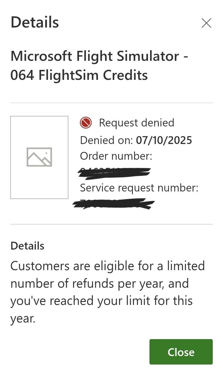 Requested a refund, and because there have been two within the last year (the oldest being 10th October 2024), the refund was instantly refused. I’ve spent hundreds, if not thousands of pounds, in the marketplace, and they won’t issue a refund for a defective aircraft that doesn’t fly. Absolutely ridiculous that if I’d purchased it 3 days later, I’d have got my money back.