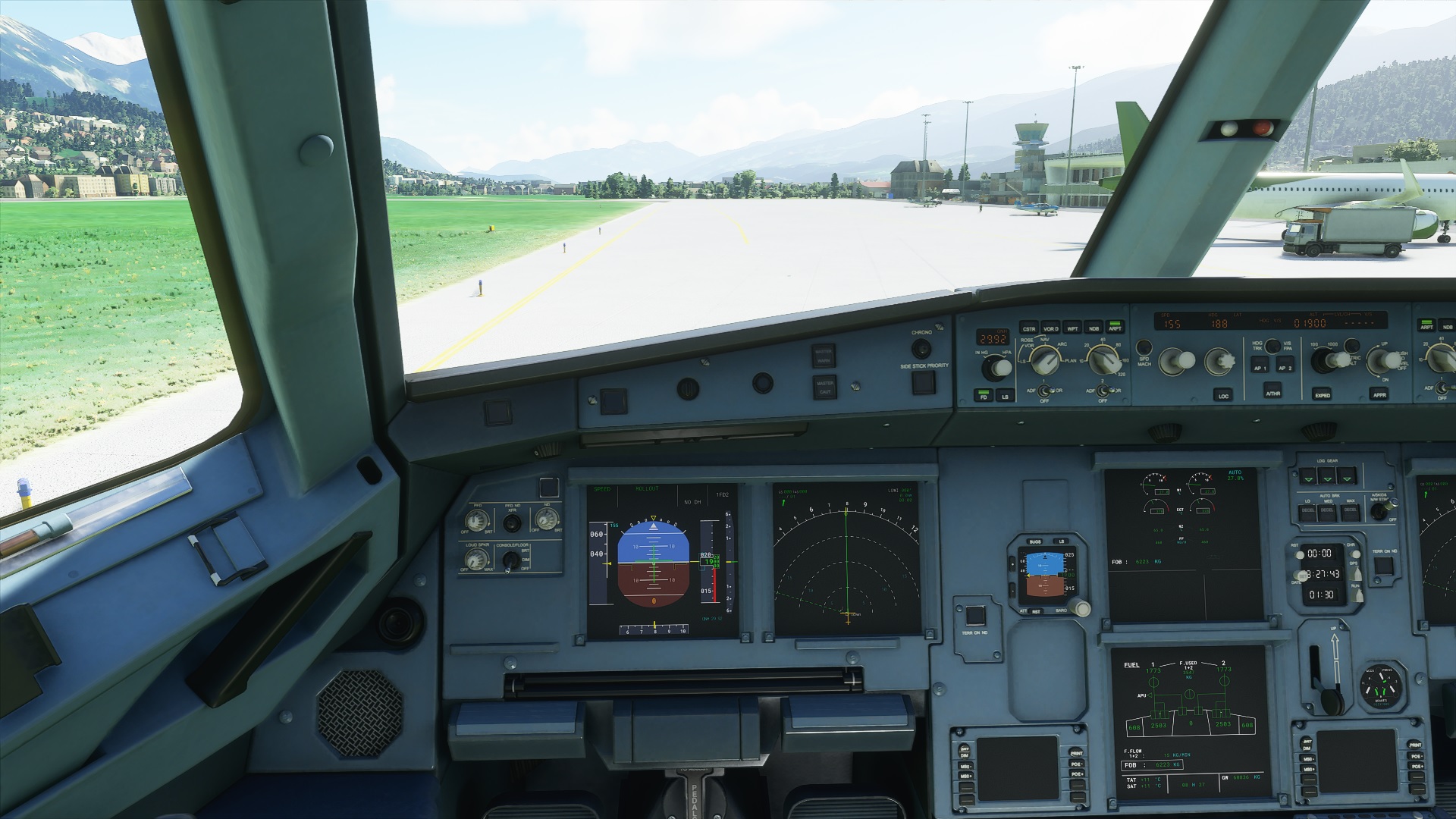 Here is another screenshot at LOWI at 10:30 am, August 24, with “few clouds” weather. Tarmac and grass is just way too bright or over-exposed some how. Click on the picture to enlarge for better quality.