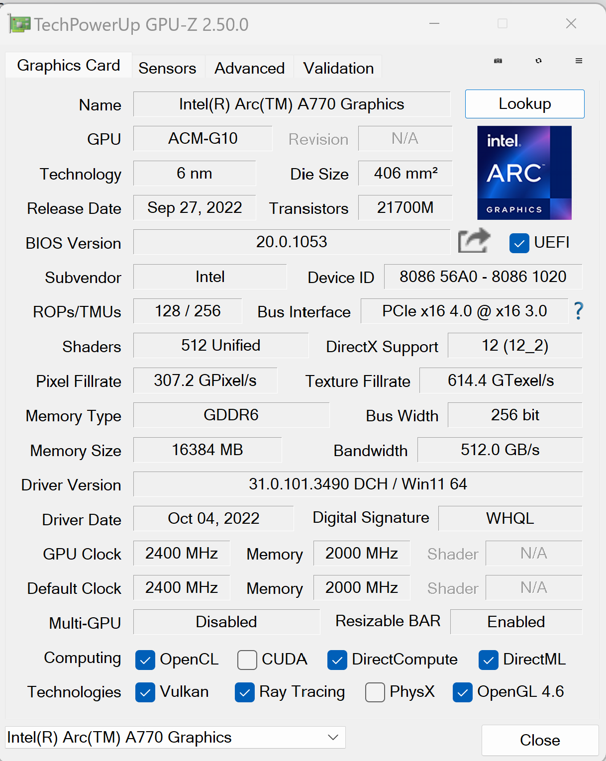 I was curious and checked and found that my 1080 has a higher speed rank (though it does not support some of the newer features) than this card. I am excited Intel is in the game now and look forward to them launching their first high end card, if they decide to. For folks on pre-1080-level cards though, this is a very fairly priced upgrade given that even old nvidia cards are still overpriced. Also nice to know this card is silent, my 1080 is LOUD when running MSFS