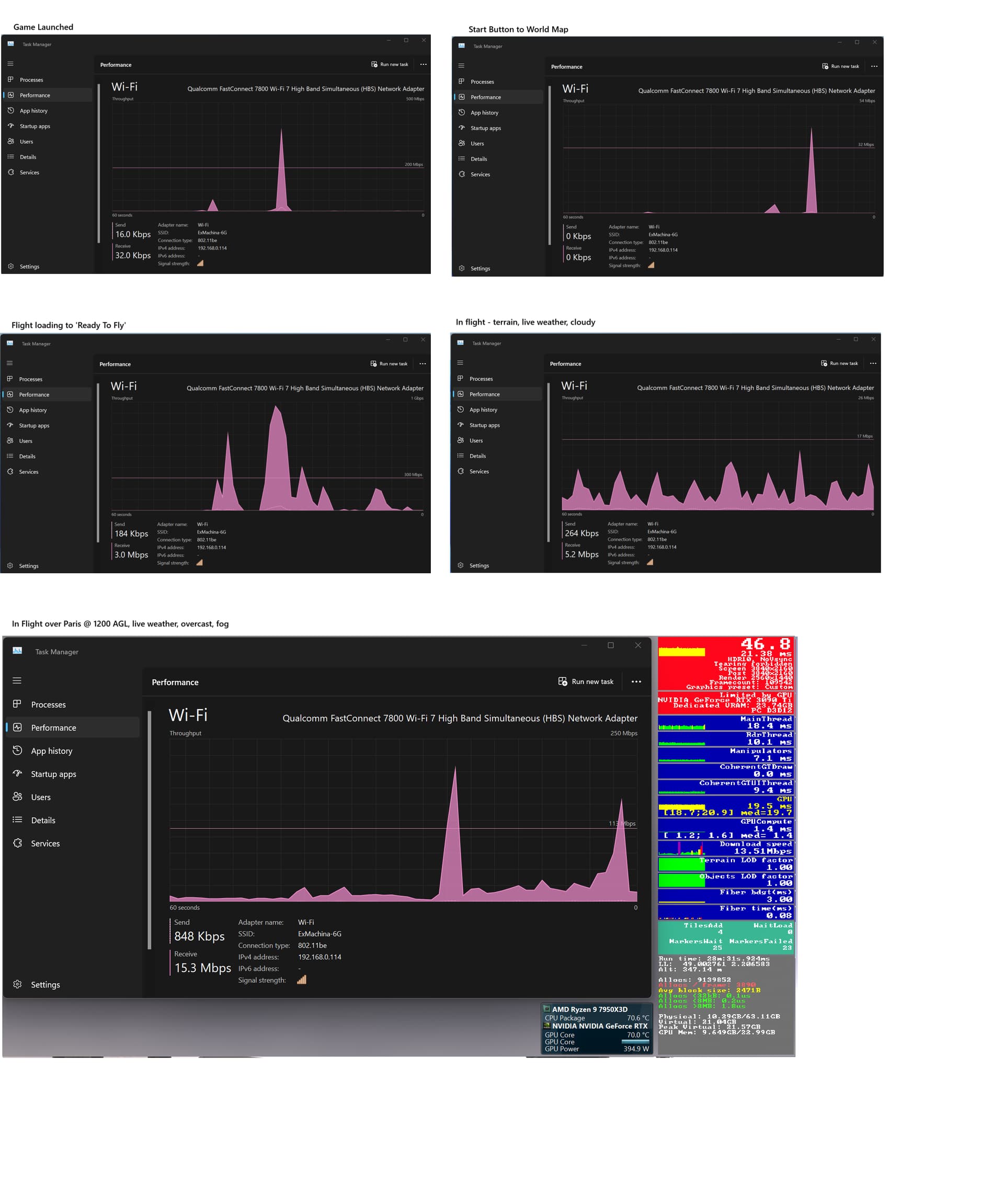 I noticed high download bitrate when the flight was loading, and as you can see, it hit over 200 Mb/s at one point in the flight. Mostly around 10-20 Mb/s.