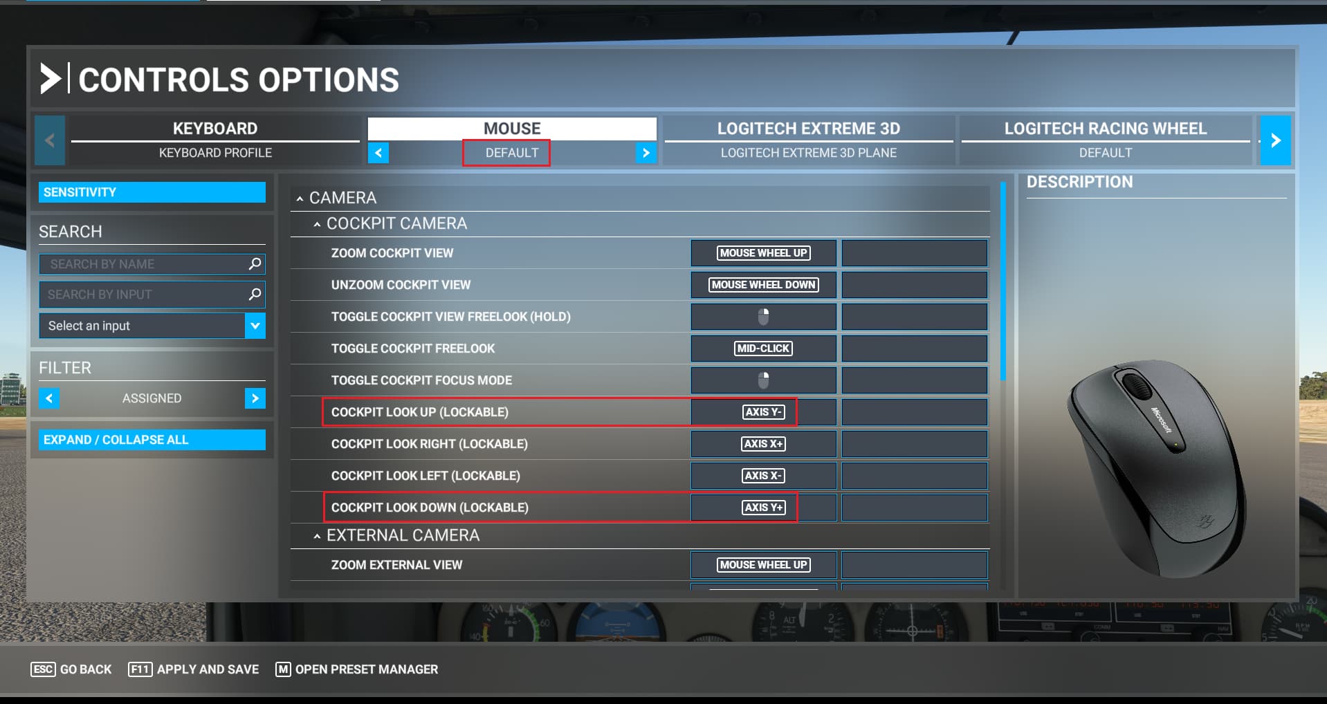 My settings for mouse cockpit freelook (Locked camera controls) are manually set as follows: