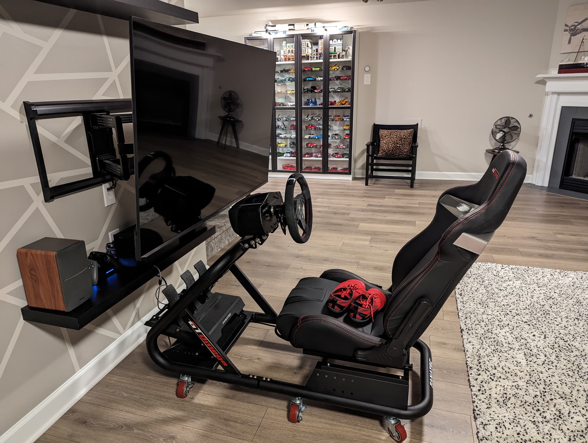 Hisense U7 eventually will switch to OLED. Articulated so can roll up the race rig or put everything away in under 5 minutes. Started with the XBSX which is also still hooked up. Hence the TB commitment. Being the height is slightly lower than optimal for the standard desk(race rig came first) by about 1", got a simple IKEA top with adjustable legs. TV is 1/2" above the desk.