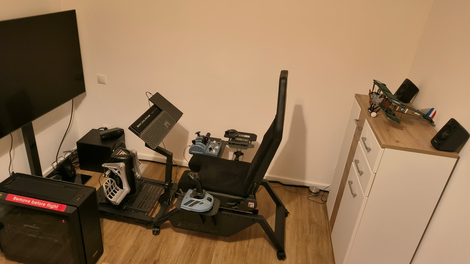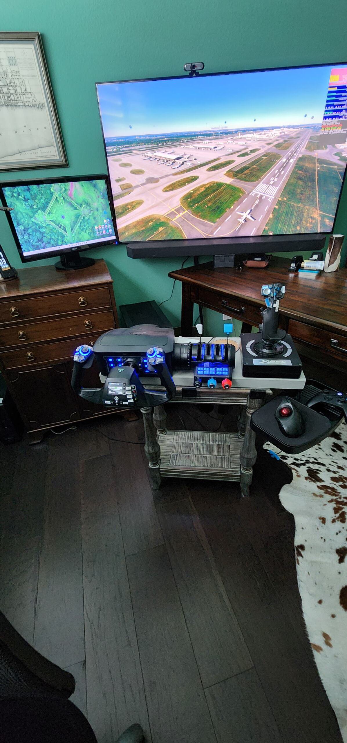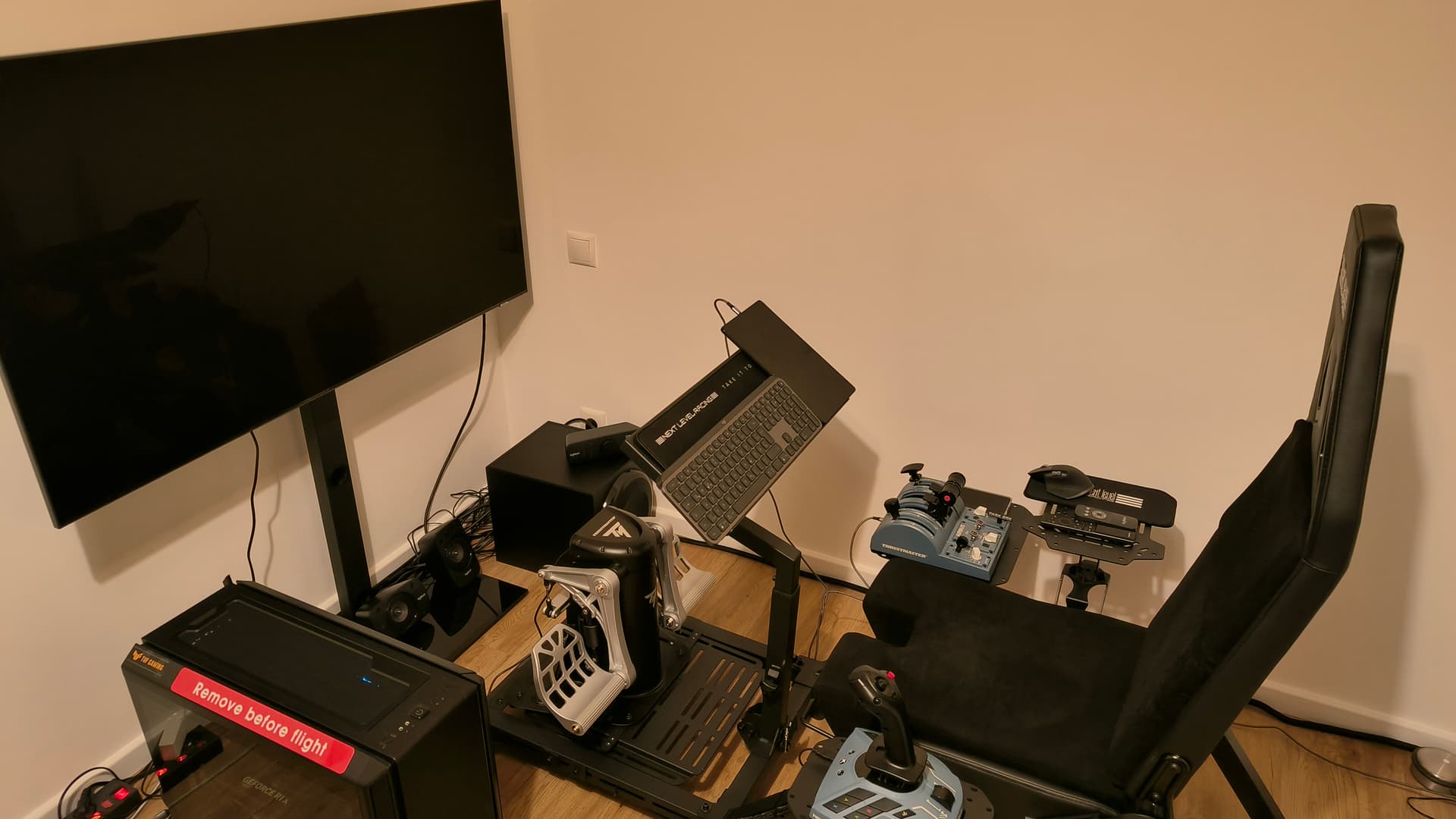 I have my TV mounted to a wall next to my desk via an articulating arm. I also have a small table that has my Turtle Beach Velocity 1 and X56 flightstick mounted to that I can slide up and plug into the front mounted usb ports on my sim PC.