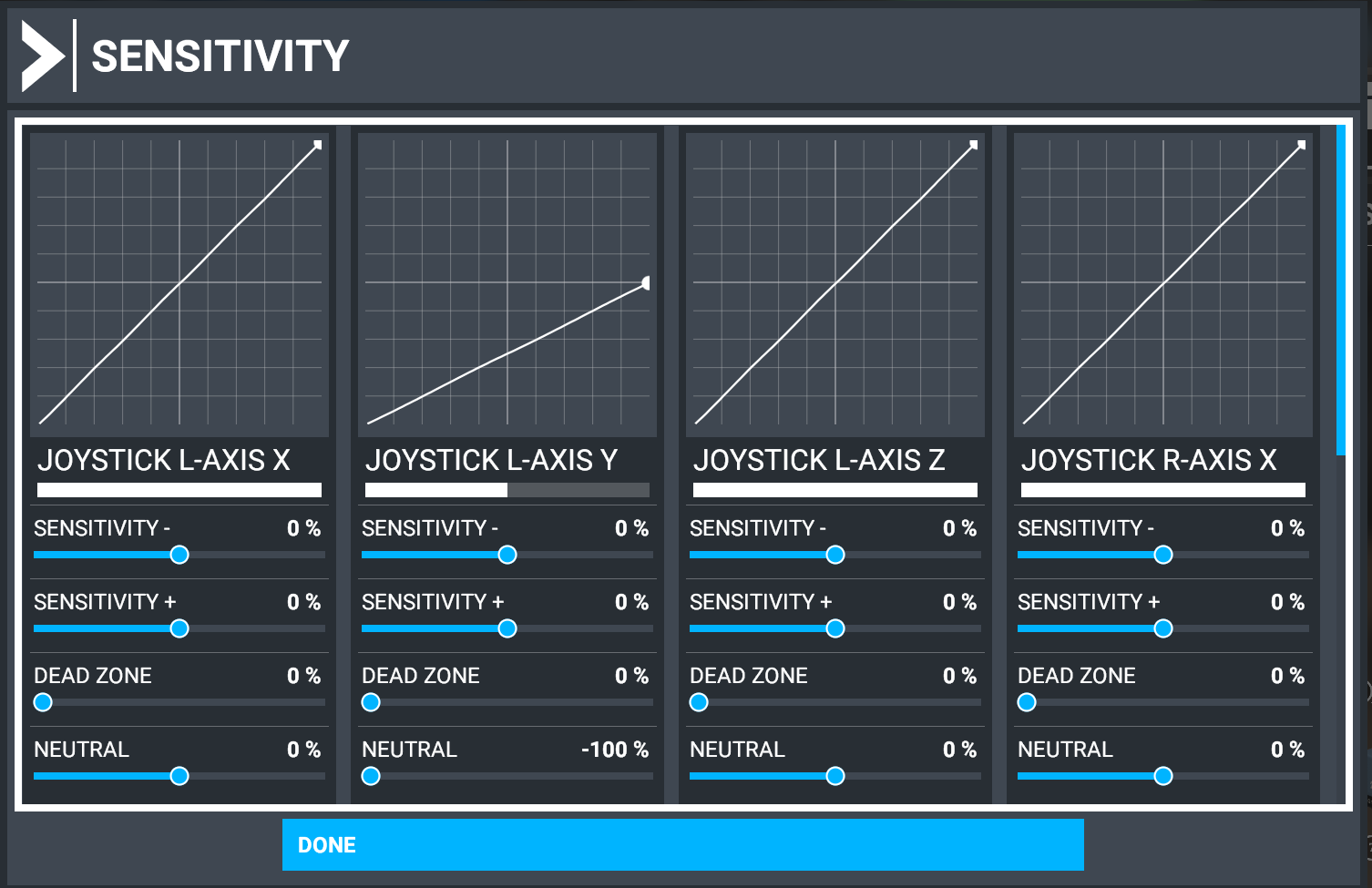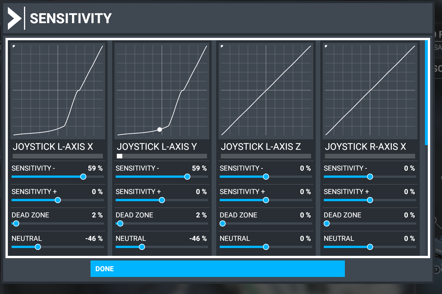 For the GA, I created different preset so that I don’t have to fiddle with sensitivity settings every time. The preset then holds your settings so you can select the one that fits for your specific flight intentions.