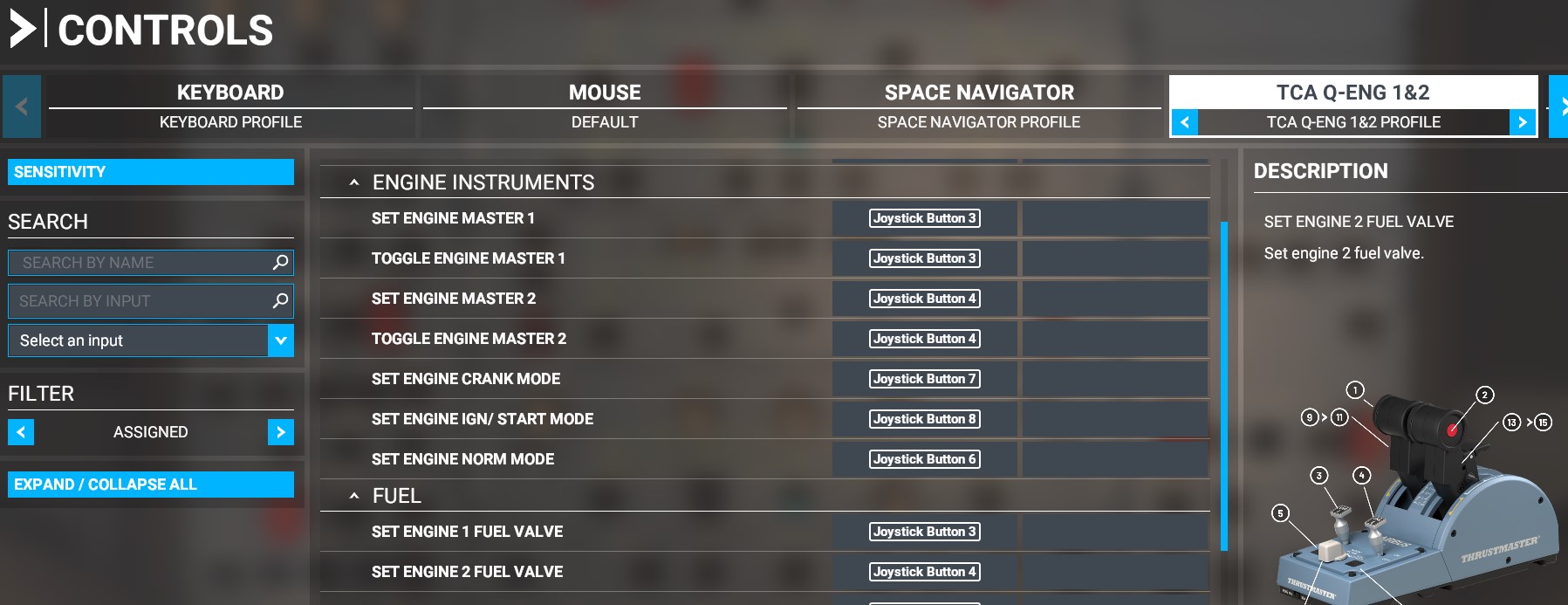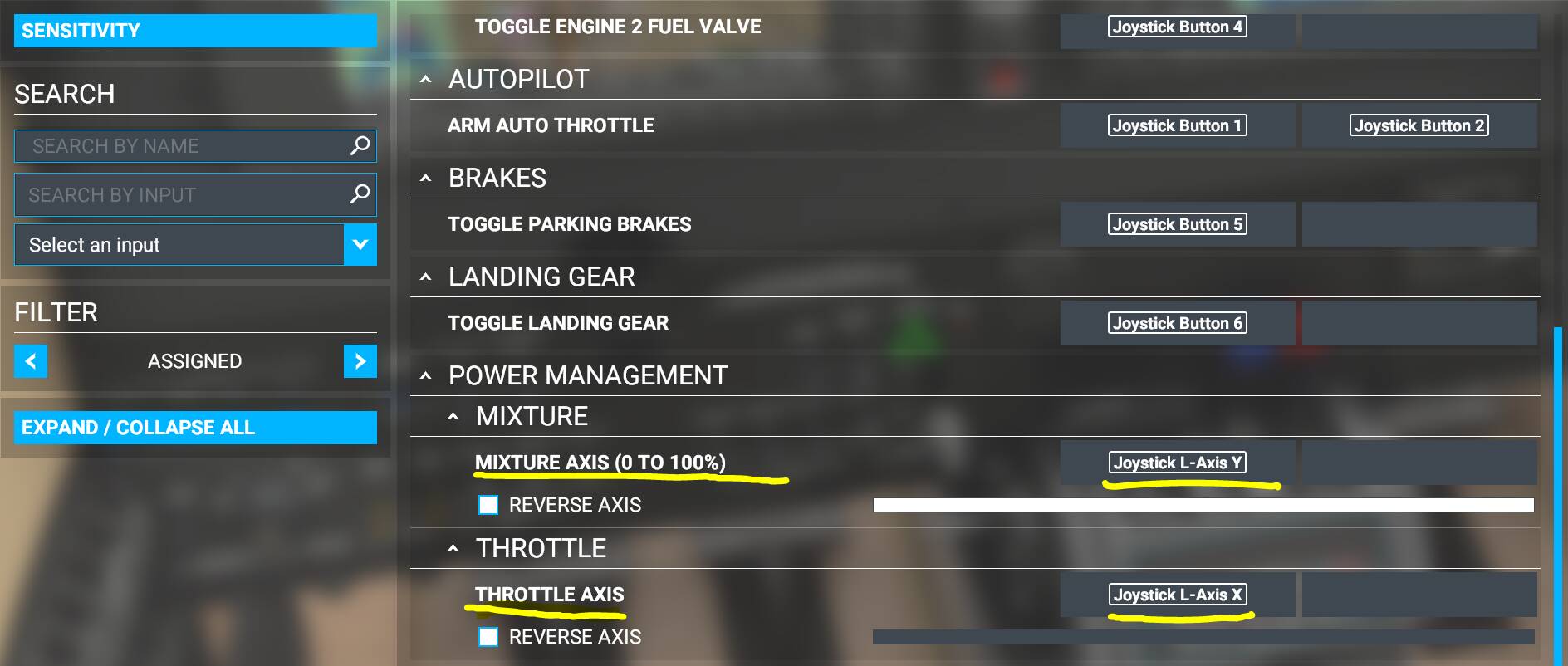 You’ll notice that the sensitivity setting for the Mixture is -100% neutral while throttle is 0% neutral. This is just the way it is but it works perfectly and uses the whole movement for the axis.