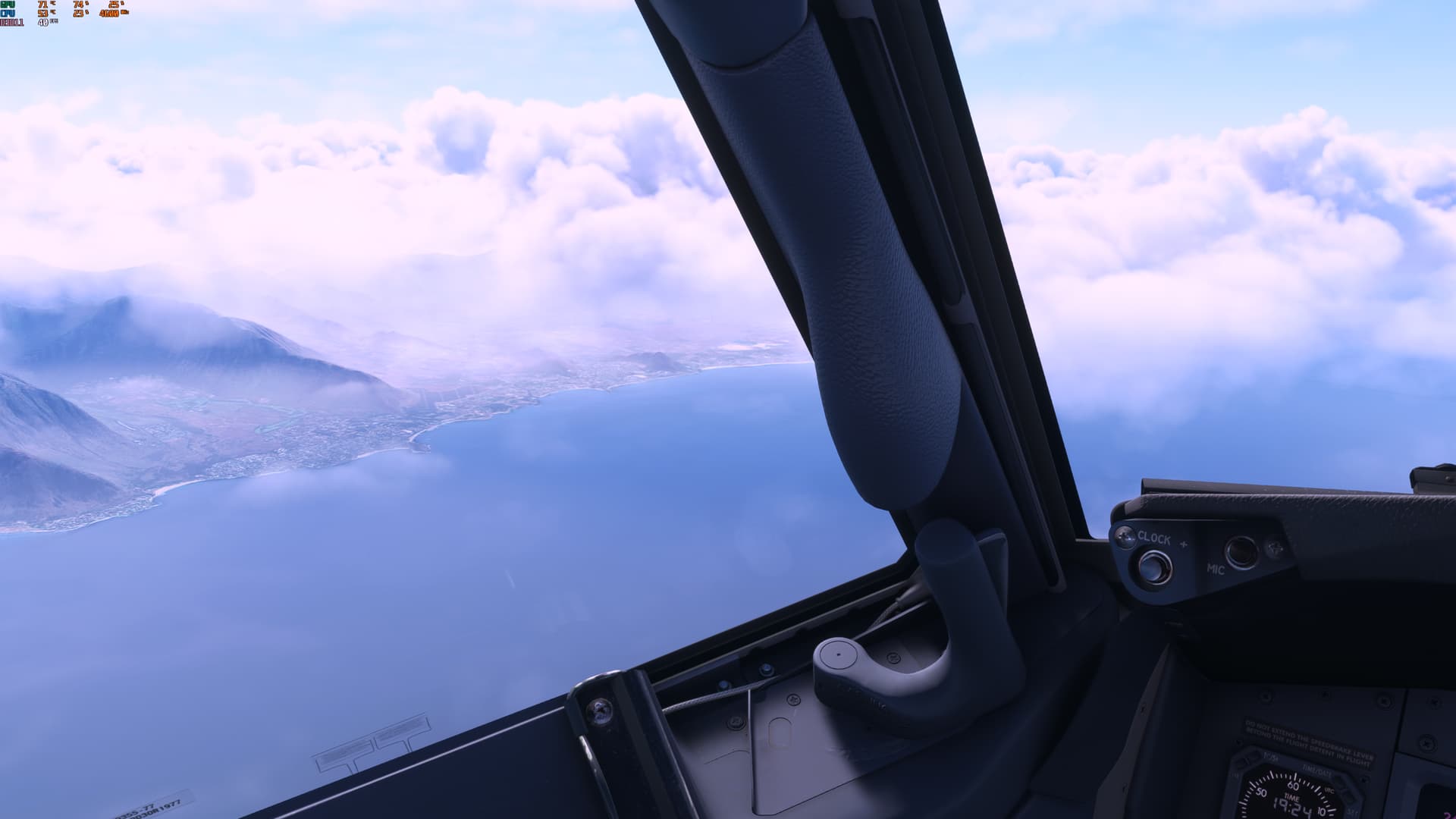 Graphics settings: 1440p with most settings on Ultra; Terrain LOD 200; Object LOD 100; trees/grass = Medium; motion blur = Off; depth of field = Medium; SU10 Beta w/DLSS set to Quality; sim render resolution 3413 x 1920; for this long flight, Vsync set to On/33% which caps refresh at 40 fps.