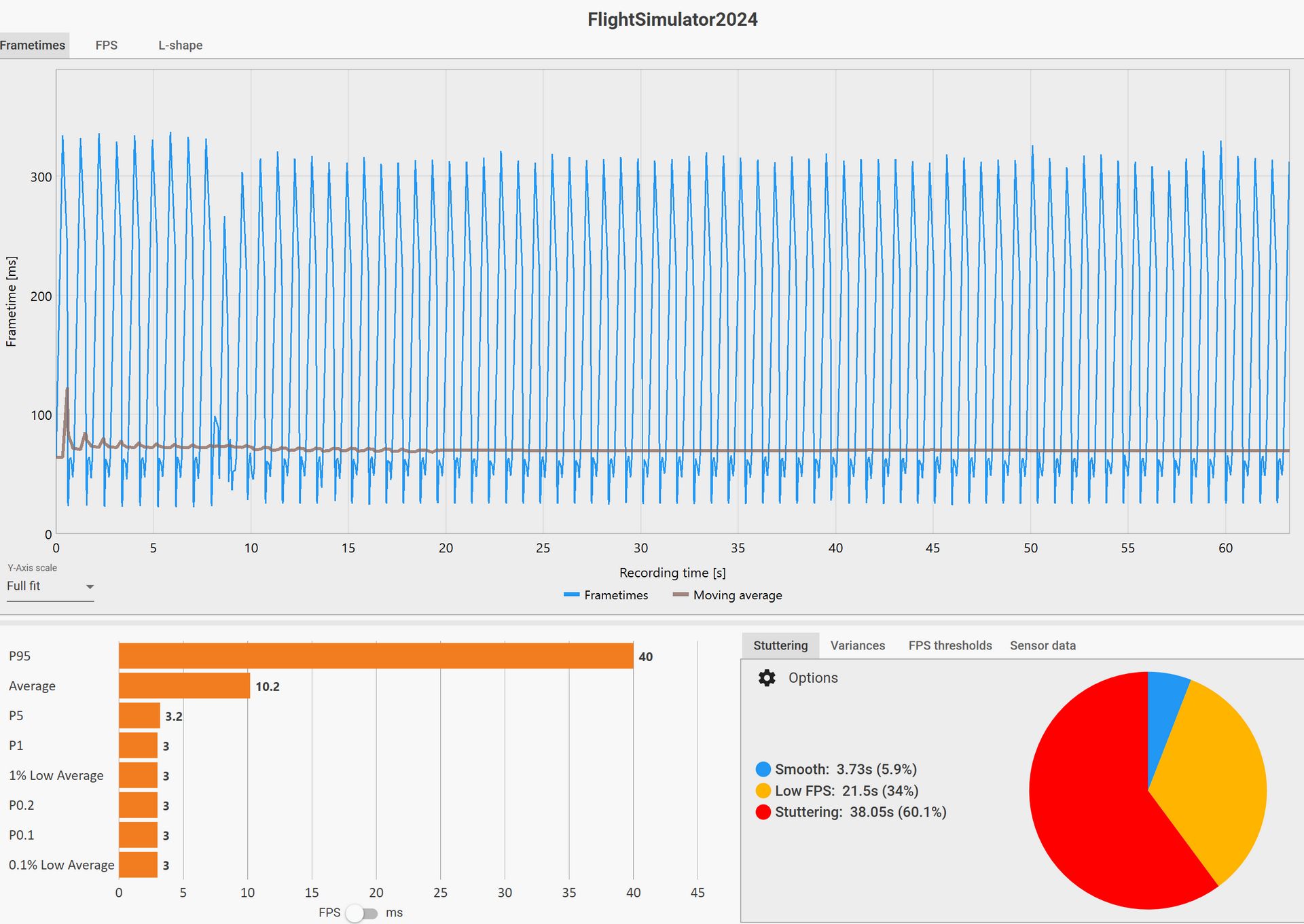 Hoping someone could check this out please. Since yesterday, when I load into CYVR Vancouver, motion is in a series of jumps. This is for aircraft movement, camera movement and ATC audio. It is like everything moves for like half a second, stops for half a second and then moves again. Non stop. I have not experienced this anywhere else and it is NOT the VRAM issue. I have experienced that a number of times so I know what that looks like. VRAM is also only at around 10GB of 14GB and dev display shows limited by main thread. CPU usage is also unusually high: over 50% while it is normally around 30% during “regular” activity. This is what CapFrameX shows: