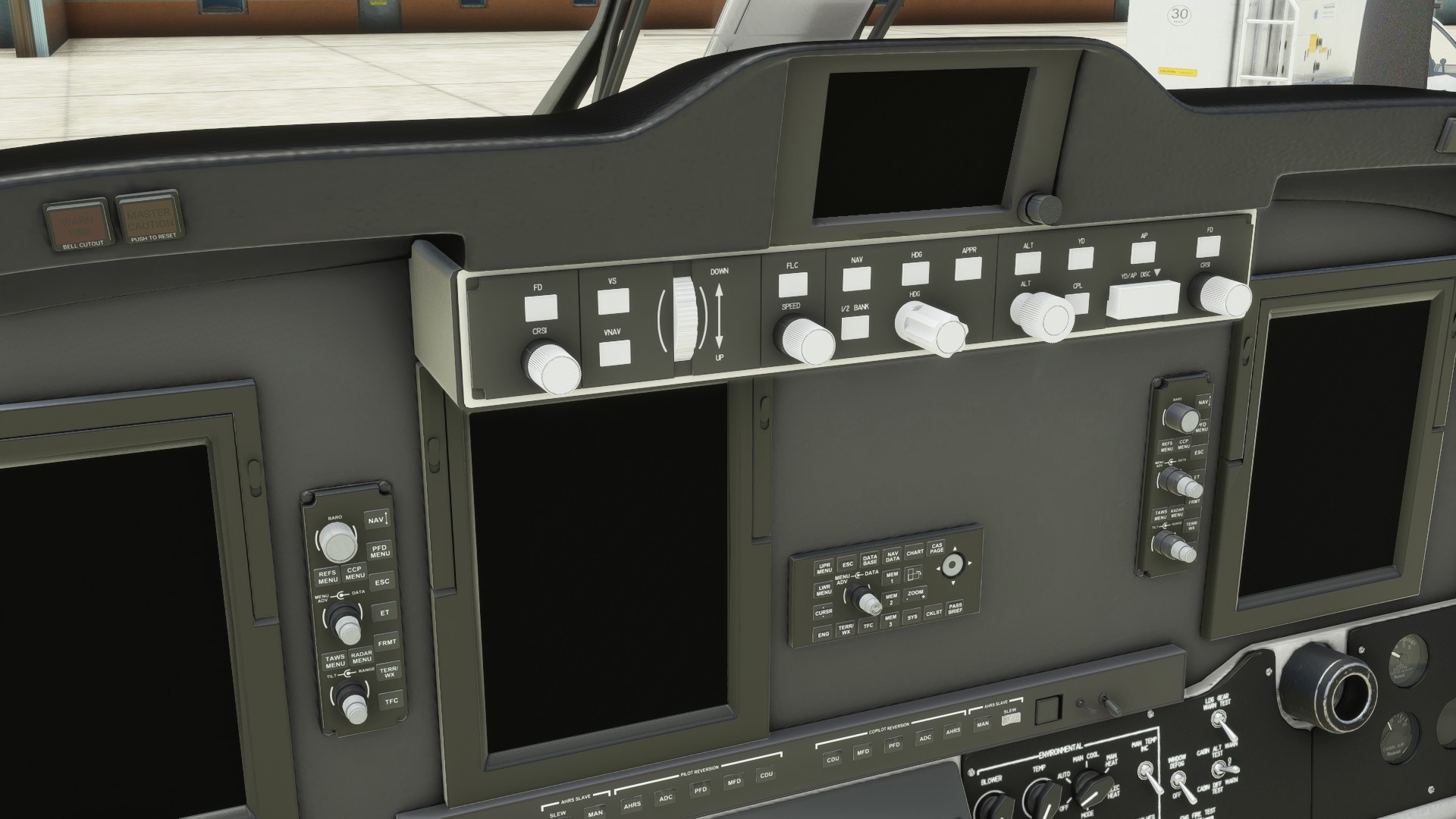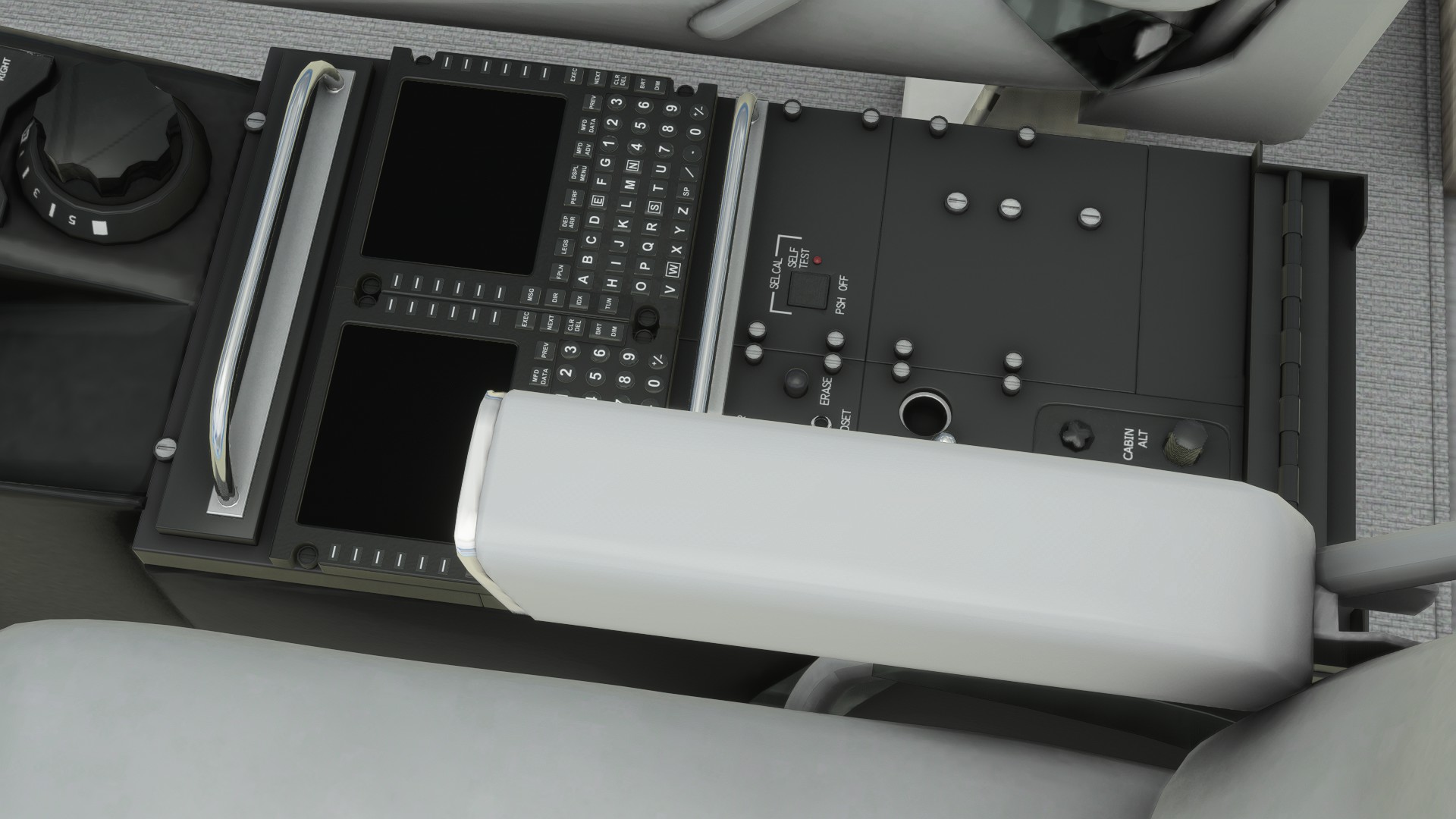Haven’t flown it yet. Pushback makes this thing jump up and down. Those armrests that inhibit the use of FMS can’t be moved. Why not use the right one, you ask? You can’t. It doesn’t react to button input, only the left one does…