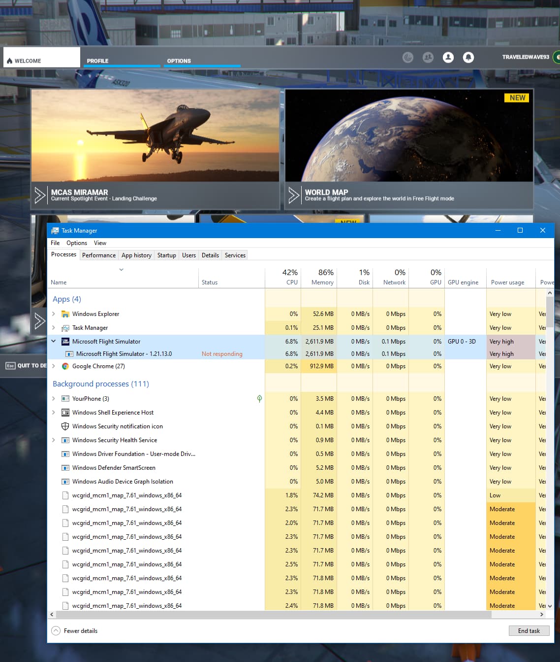 During the delay the flight sim entry in Task Manager shows ‘Not Responding’ as the status. The CPU percentage and memory usage numbers move slightly and the sounds work as normal. But the GPU percentage drops to zero and then jumps back to the 70s when the delay is done.