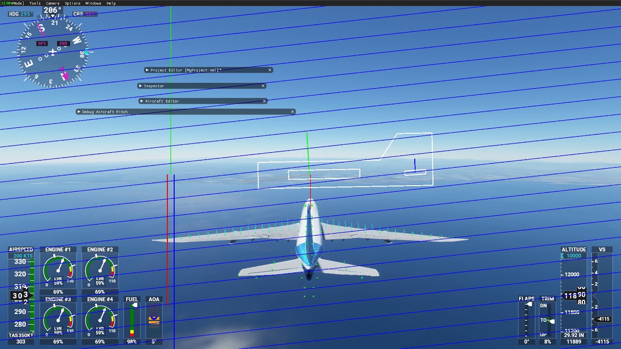 I used full up elevator to force the aircraft (unsuccessfully) into an accelerated stall, the second attempt I used full up stabilizer and full up elevator, again unsuccessfully. I have to admit, I don’t know exactly what is illustrated in the developer mode but it seems the angle of attack does not correspond to the angle of attack indicator on the dashboard. If you look at the angle between the airflow and the box which represents the wing, it is no where near stalling angle while the aircraft is exceeding the critical angle of attack according the AOA indicator with no loss of lift, the aircraft keeps climbing at an insane rate.