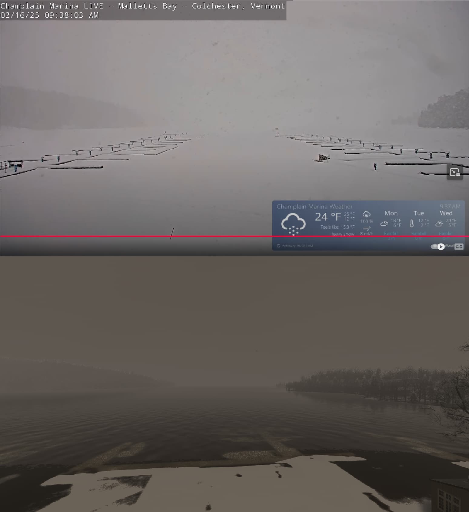 Now January 28th, we have 24 inches of thick ice on the lake but about 15-20 cm (5 inches) of snow on the ground, so⊠no ice in the sim, and will wait a long time before getting 72 cm. While I havenât found ice up to N 51 degrees (see Manicouagan reservoir below, North of CMN5), ice should be way down South in New-England states.