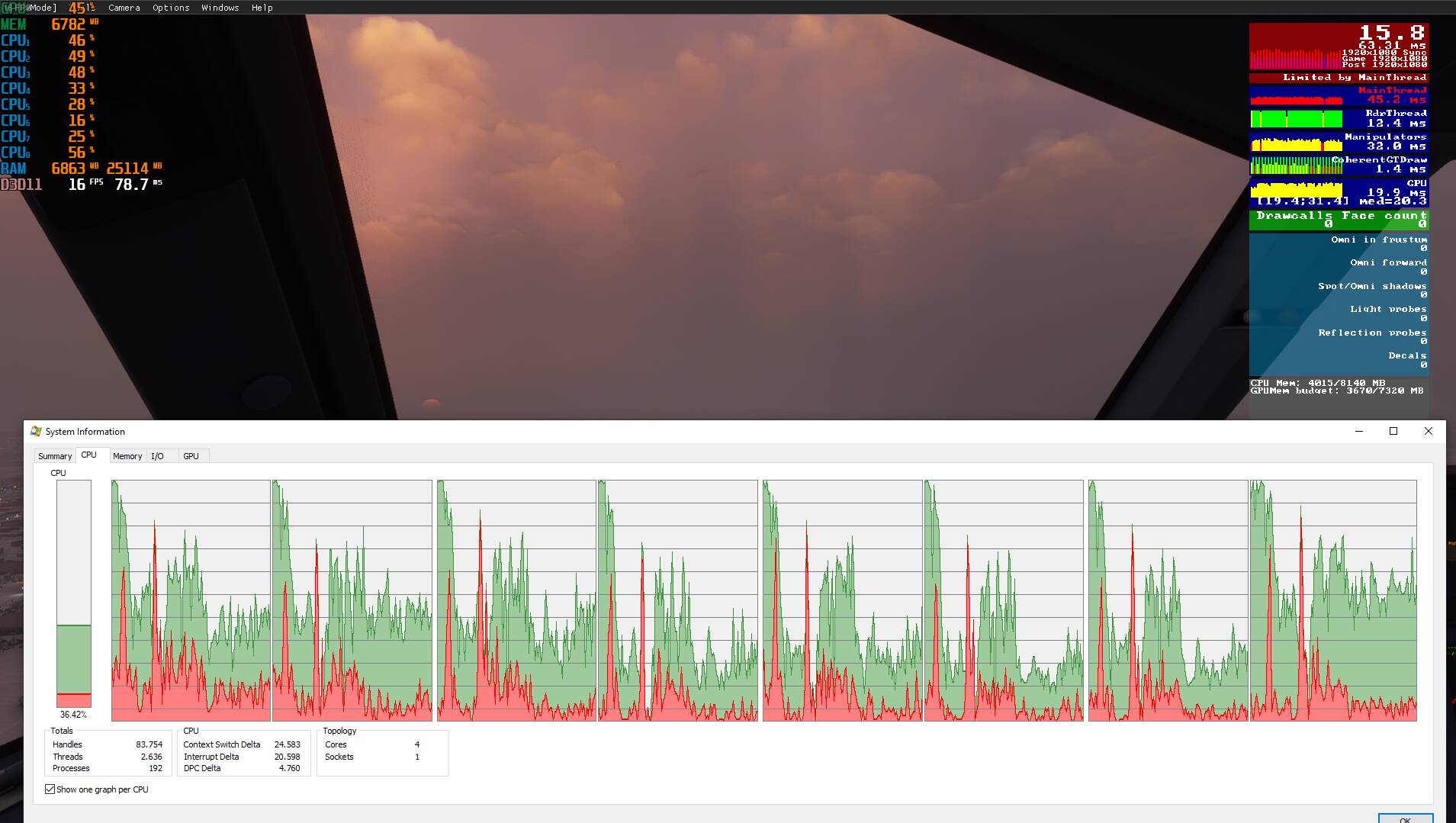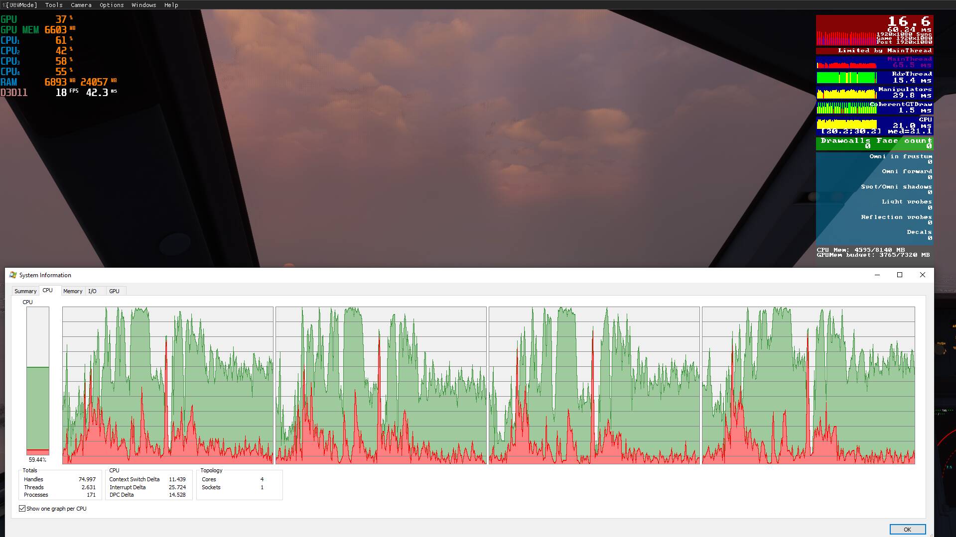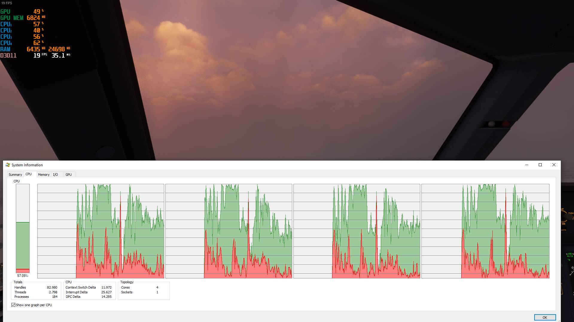 As you can see in this shot, the CPU is utilizing ALL cores while loading the landing challenge, but all cores drop to around 60% when in flight. The measurements of the process explorer (a tool from the sysinternals suite which I replaced my task manager with) are confirmed by MSI Afterburner / RTSS in the top left corner. In the last shot in this post, this is also confirmed by the sim itself. Hyper threading is of in this case.