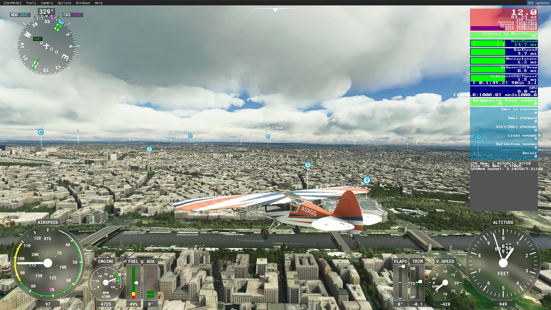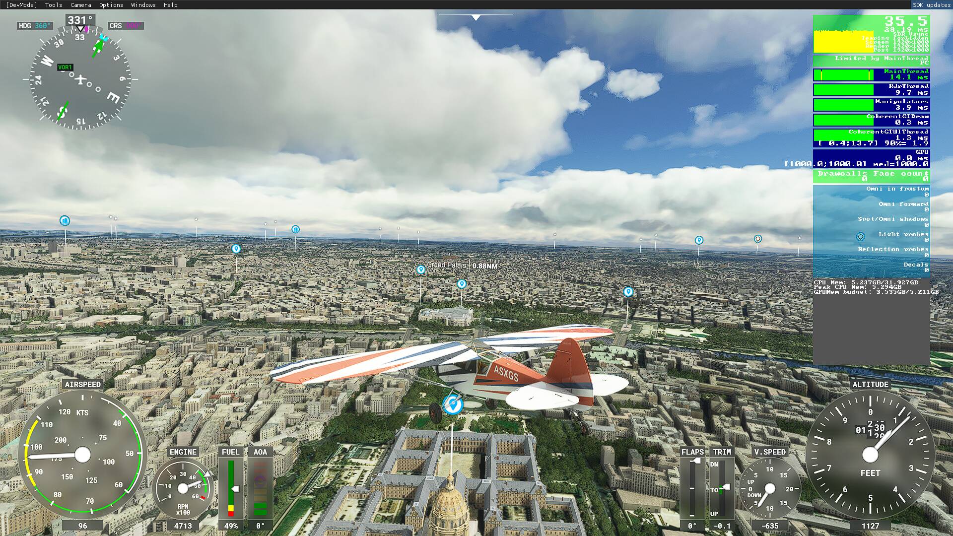 Hi all… Today, I have completed SU5 updates and made some flights. But there is something strange here on my side… My PC specs: Ryzen 3600x cpu- radeon 5600xt gpu - 32 GB 3200 Ram- nvme - old monitor (1080p 60hz). Before update, I could not fly over paris. FPS was very low (5 to 10) although my settings were medium. (dev fps counter was saying "Limited by GPU).. That is normal. But after SU5 update, (again in 1080p of course) with HIGH END settings, i can fly over over Paris with 35 fps. Even, I set everything to “ULTRA” still FPS is over 35. (Does not matter vsync is off or on and fps limited to 30) . As last, i tried with rendering scale 200% and everything to “ULTRA” then my Fps dropped to 12. During all these tests, as you can see on following screenshots, I never get a “Limited by GPU” warning in dev mode fps counter. It is “Limited by mainthread” all time. Is it normal?