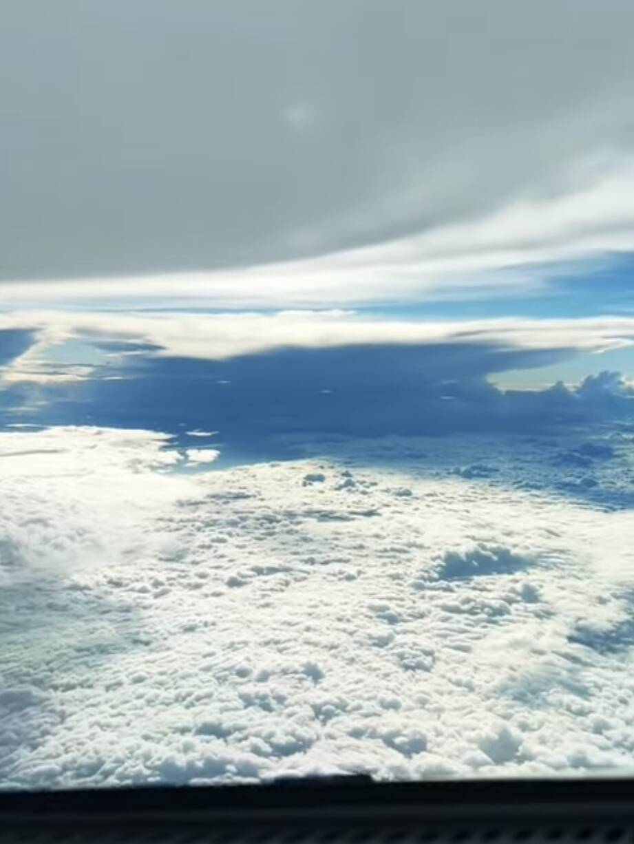 Another similar storm system view from a cruising aircraft in real life. The clouds extend well into the atmosphere, and above the plane. (not my photo)