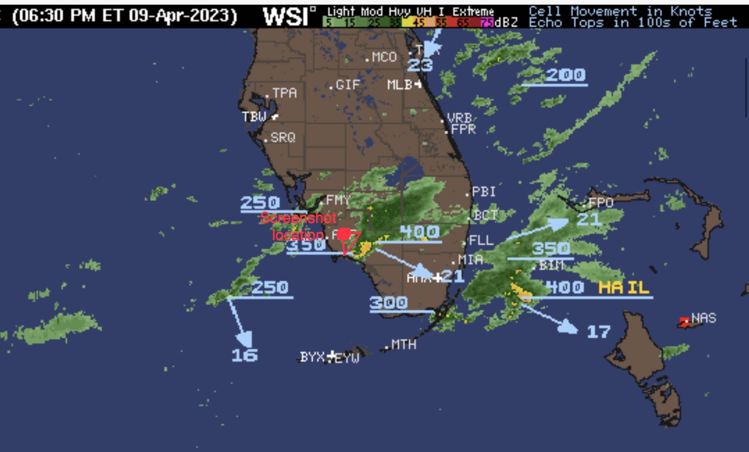 The following screenshot shows detailed parameters pertaining to this system. The top altitude of precipitation (echo tops) is FL350/FL400, moving southeast at 21kts, as indicated by the blue text overlay. I’ve marked the approximate location of the MSFS screenshot on the map below.