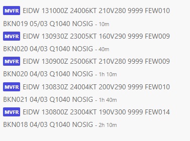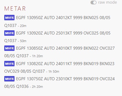 As you can see, even when the METAR reports cloud cover in these places, it’s not been drawn in. Temps, pressure, wind match up correct. But cloud cover is totally wrong. I’ve included previous METARs so you can also see it’s not a case of it transitioning from clear skies as all 3 airports here have reported cloud for past 2-3 hours.