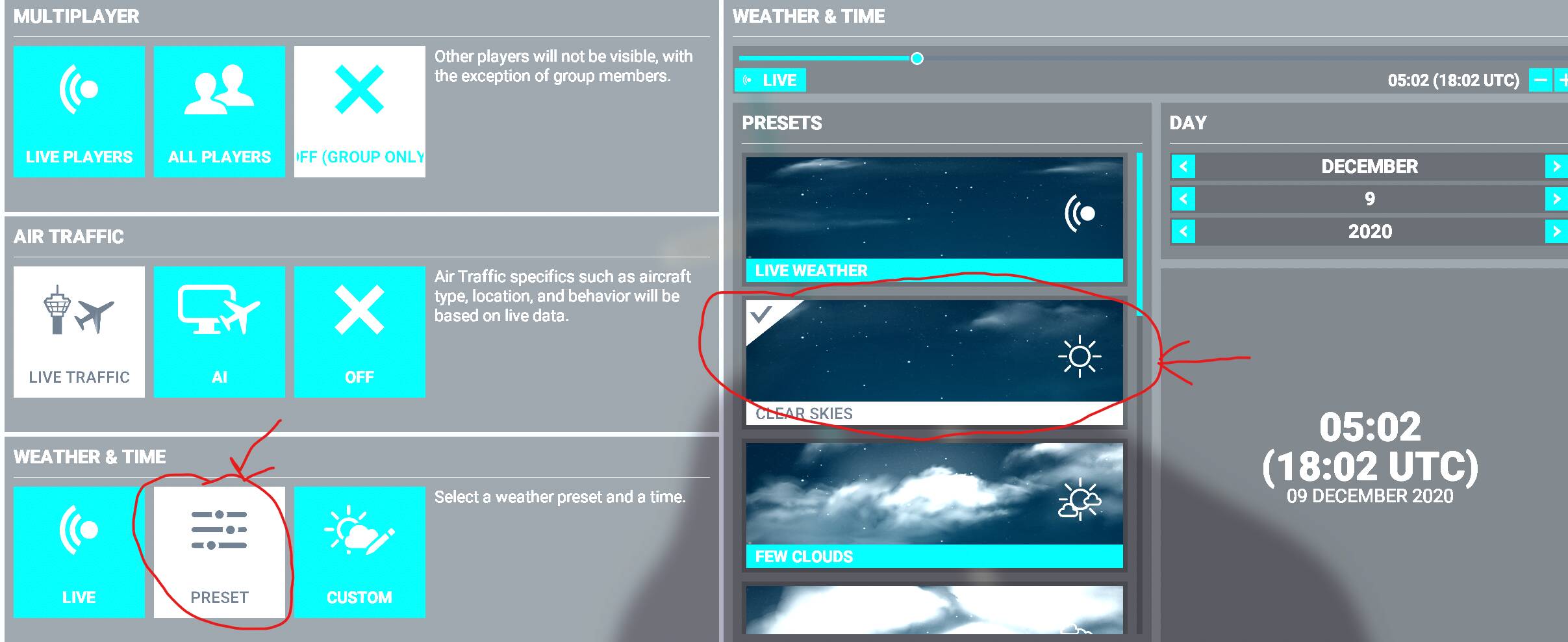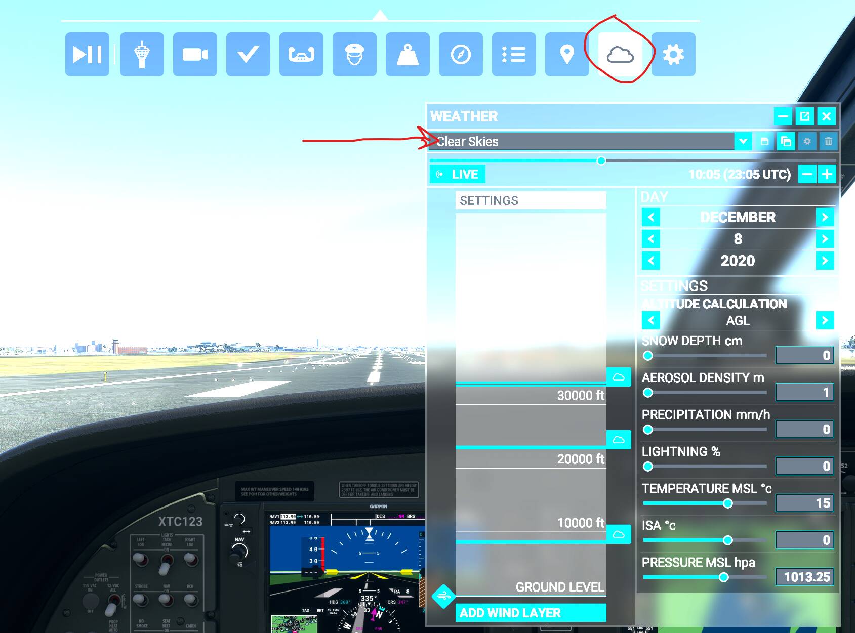Then click on the toolbar at top of the screen and select the cloud icon and change the bit that says clear skies to Live weather, wait for a few seconds and it should change to live weather.
