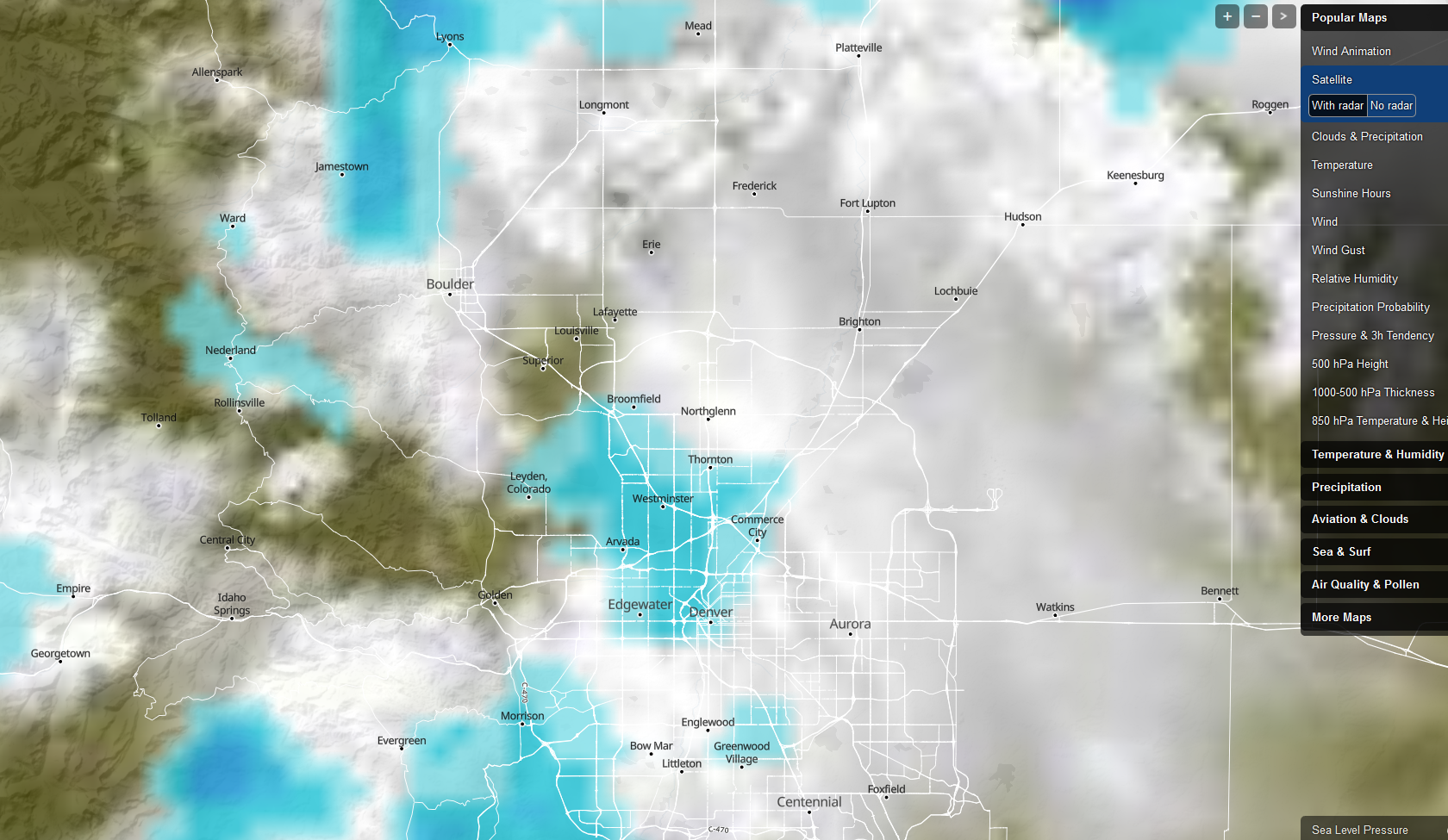 This is what the weather has looked like for the last (Almost) 3ish hours. A cloudy occasionally rainy system rolling over Denver.