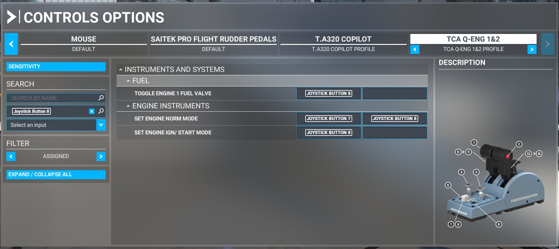 I’m trying to set up my Thrustmaster Airbus Throttle Quadrant in another way than default. I want to use button 5 & 6 to toggle the engine starters, and use switches 3 and 4 to to toggle the ENGINE RUN/STOP buttons behind the glass covers in the Longitude cockpit.