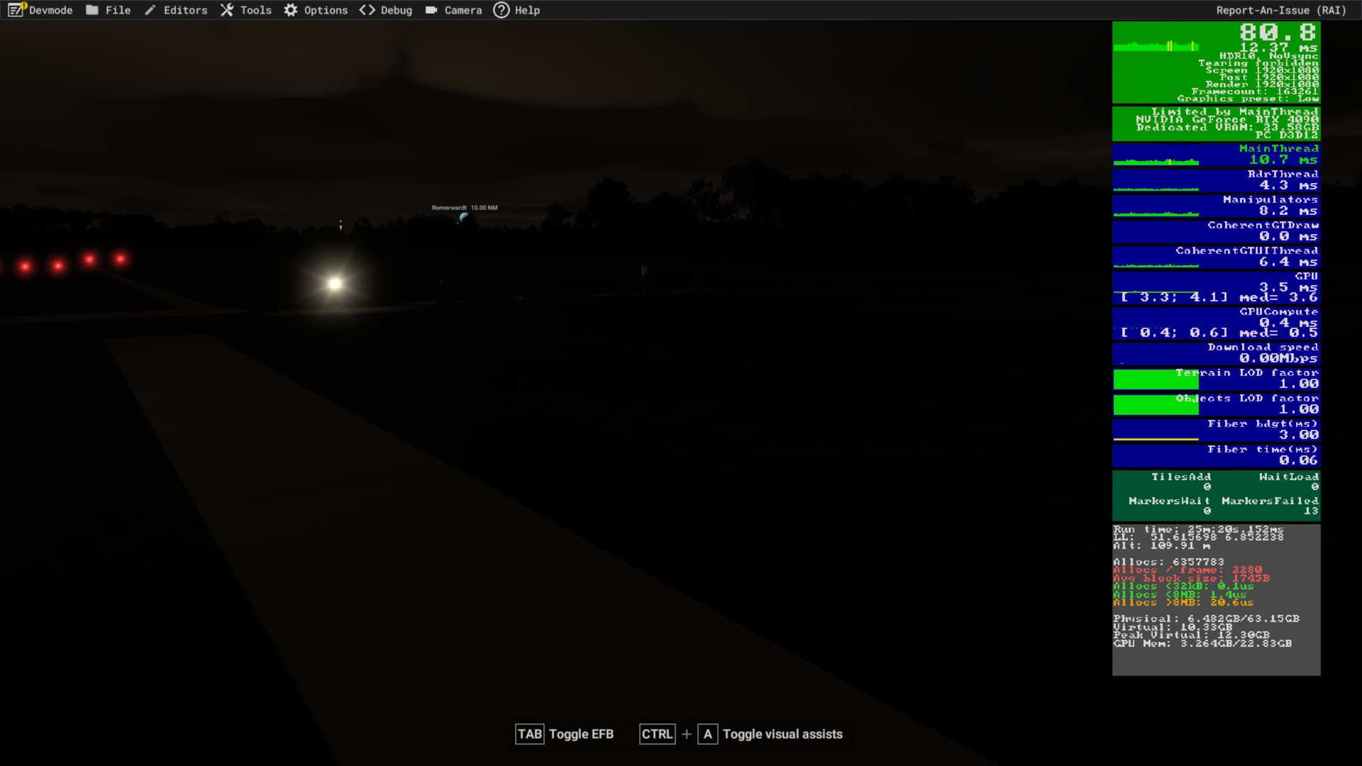 Some things that I tried: Various resolutions, airports, planes, NVidia driver versions (576 series and 572), clearing the rolling cache, clearing shader caches, other games and benchmarks (those work fine), measuring FPS with other tools than Dev Mode (and disabling that), disabling Game Bar and NVidia Overlay.