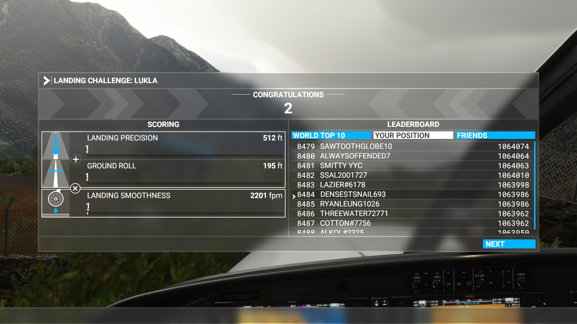 Did anyone see this at Ísafjördur challenge ? I’ve got a 3 points last week.. I did not save it. The landing was S-curved over the runway, touchdown forced, all the way near the end, on the left side. Short hop (that’s why I got a 2 for roll ?). I could break, but it nearly touched end of runway. Corrected direction with rudder to go to the center line. I got “Congratulations, 3”