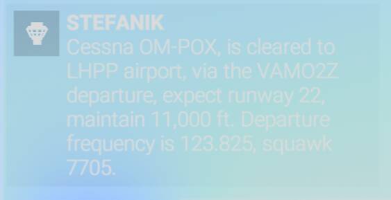 “Cessna OM-POX, is cleared to LHPP airport via the VAMO2Z departure, expect runway 22, maintain 11,000 ft. Departure frequency is 123.825, squawk 7705”