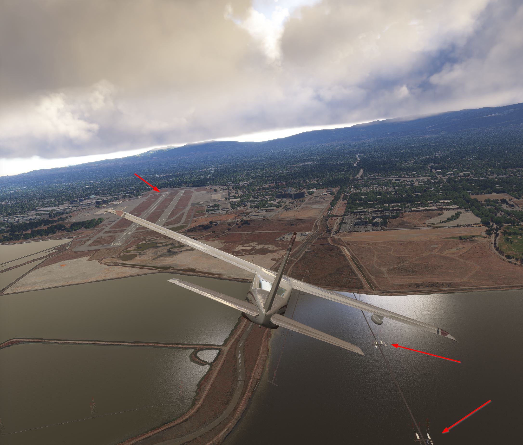 Very happy with the program but here is a small artifact that perfectionists may want to fix. This is off the departure end of Runways 32L&R at KNUQ Moffett Federal Airstation in Mountain View California (Top Red Arrow). There are some powerlines on pilings that go into San Francisco Bay here and they have grown some nice sailboats.