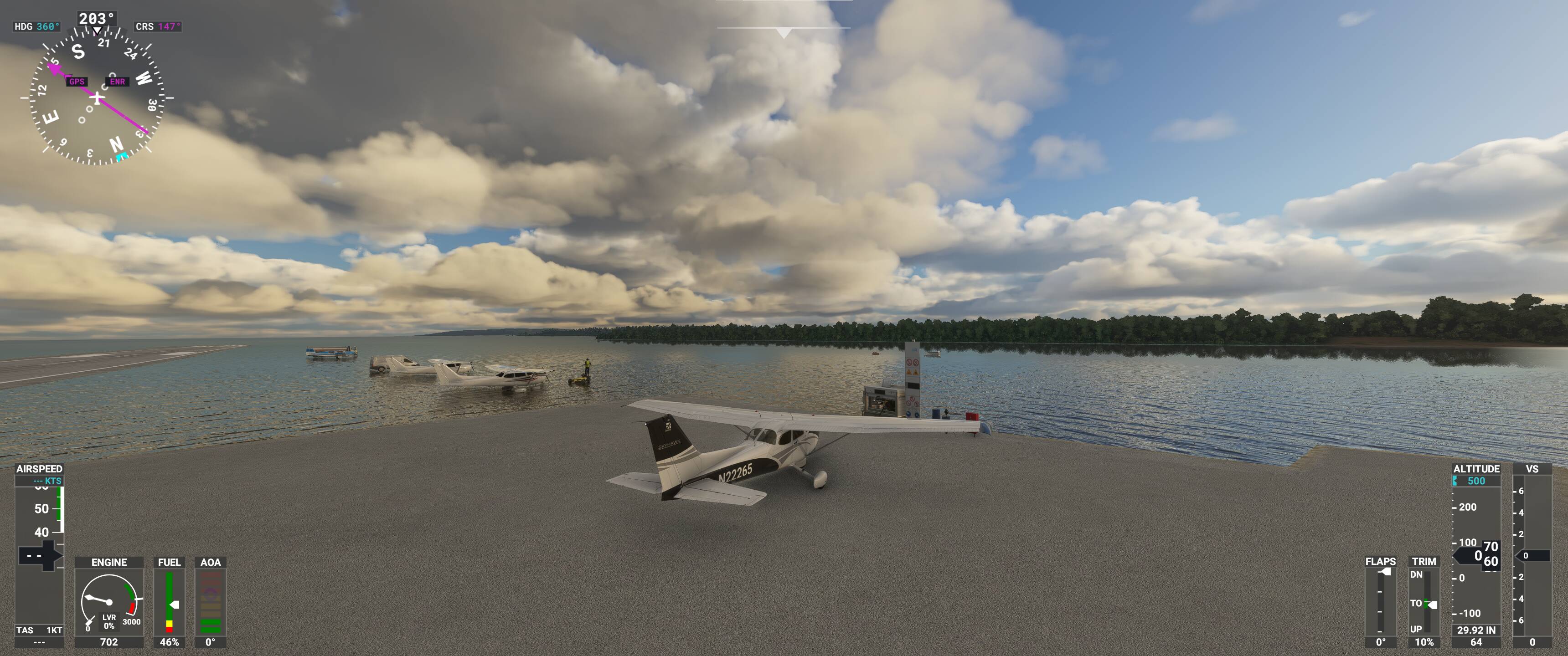 The runway at airport WA44 is surrounded by water. The airport and surrounding area should not be underwater. Been there!