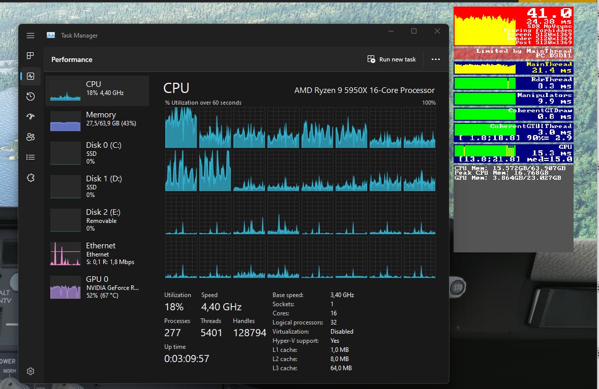 I have a intel i7 11700k Iv disabled Hyper Threading in my Bios im finding that its giving me better preformace and no big FPS drops on short haul and long haul flights Since SU9