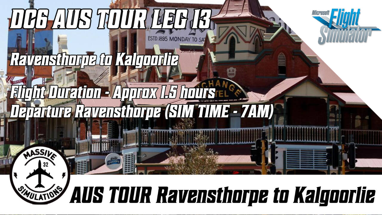 Leg 13 Wednesday 25/8 Flight Details - Ravensthorpe to Kalgoorlie. 1.5 Hour flight into Kalgoorlie. Flight zig-zags northward via Esperance, Lake Johnston and Norseman. Please use PMDG DC6B with only the PMDG Ansett Livery as other third party liveries can cause issues in the simulator. See you all on the ramp. Flights Depart 9.30PM AEST/11.30AM UTC. Please note that the IN-SIM departure from Ravensthorpe will be 7am.