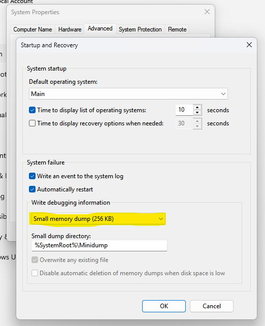 When set to small memory dunp