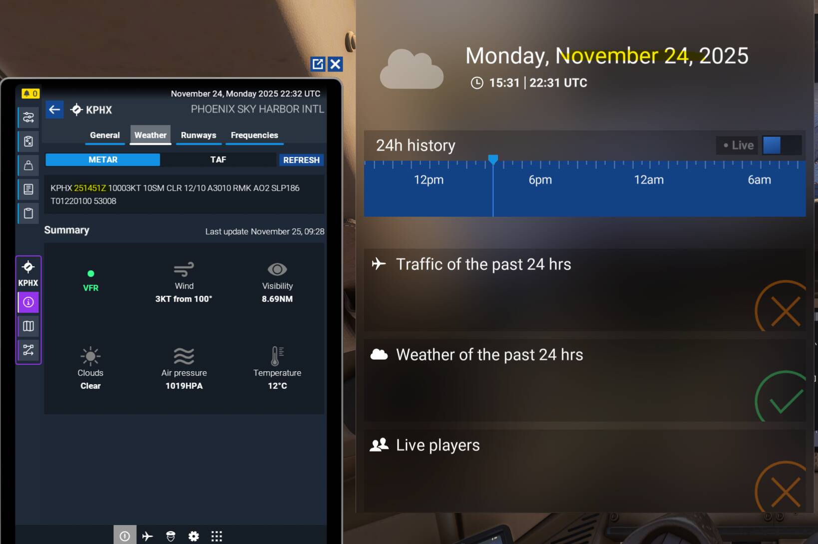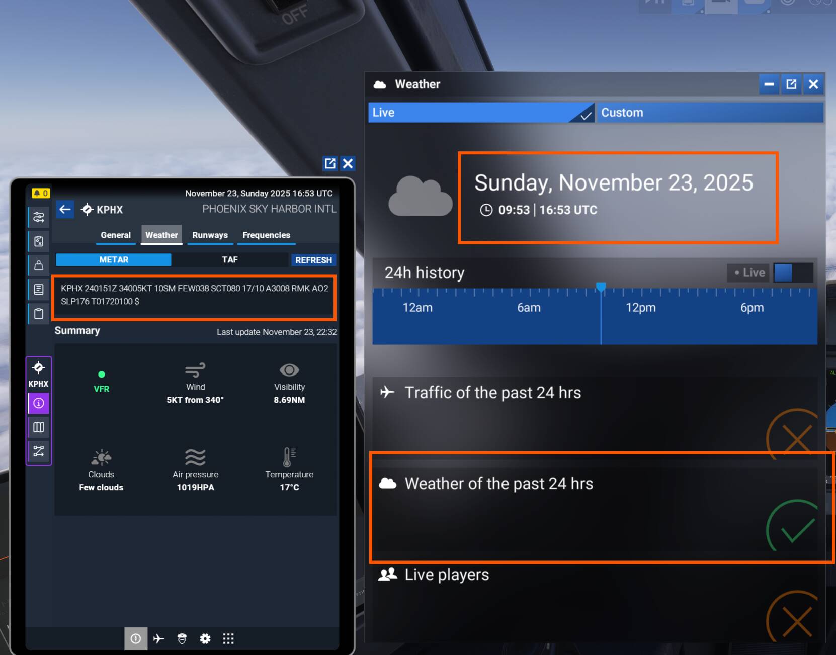 In the screenshot below my time is set to 11/23/2025 16:53 UTC but the metar is showing for 11/24/2025 01:15 UTC