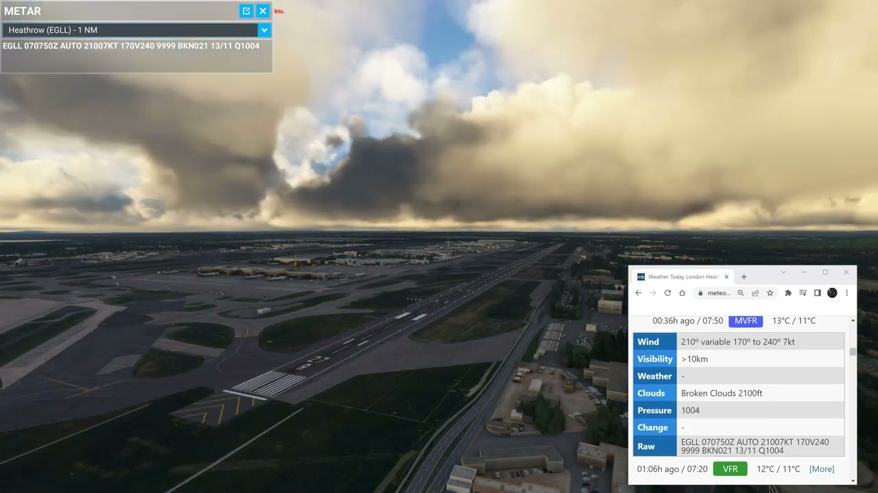 Here is the METAR switch. Notice the few clouds reported in Meteoblue page at the beginning of the clip changing to broken clouds then the weather suddenly switches 2 minutes later in the sim. Notice the yellow tone in the clouds after the switch.