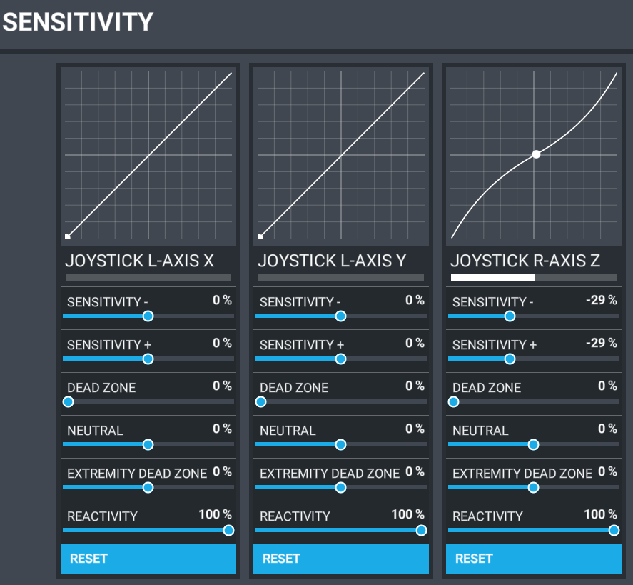 This is what I am seeing when I open sensitivity after calibrating with MFG software: The left brake starts at the bottom with your settings it doesn’t get to the end of the dead zone which is about 1 square only. Thats with full deflection of the brake. The right brake starts in the middle and goes to the top of the line. The rudder does as expected. The right break has a white line halfway across just as the rudder has.