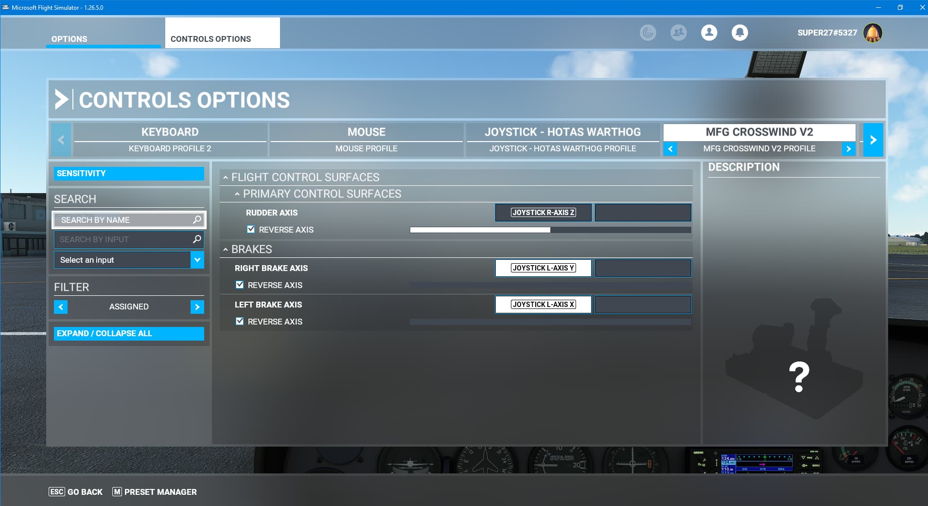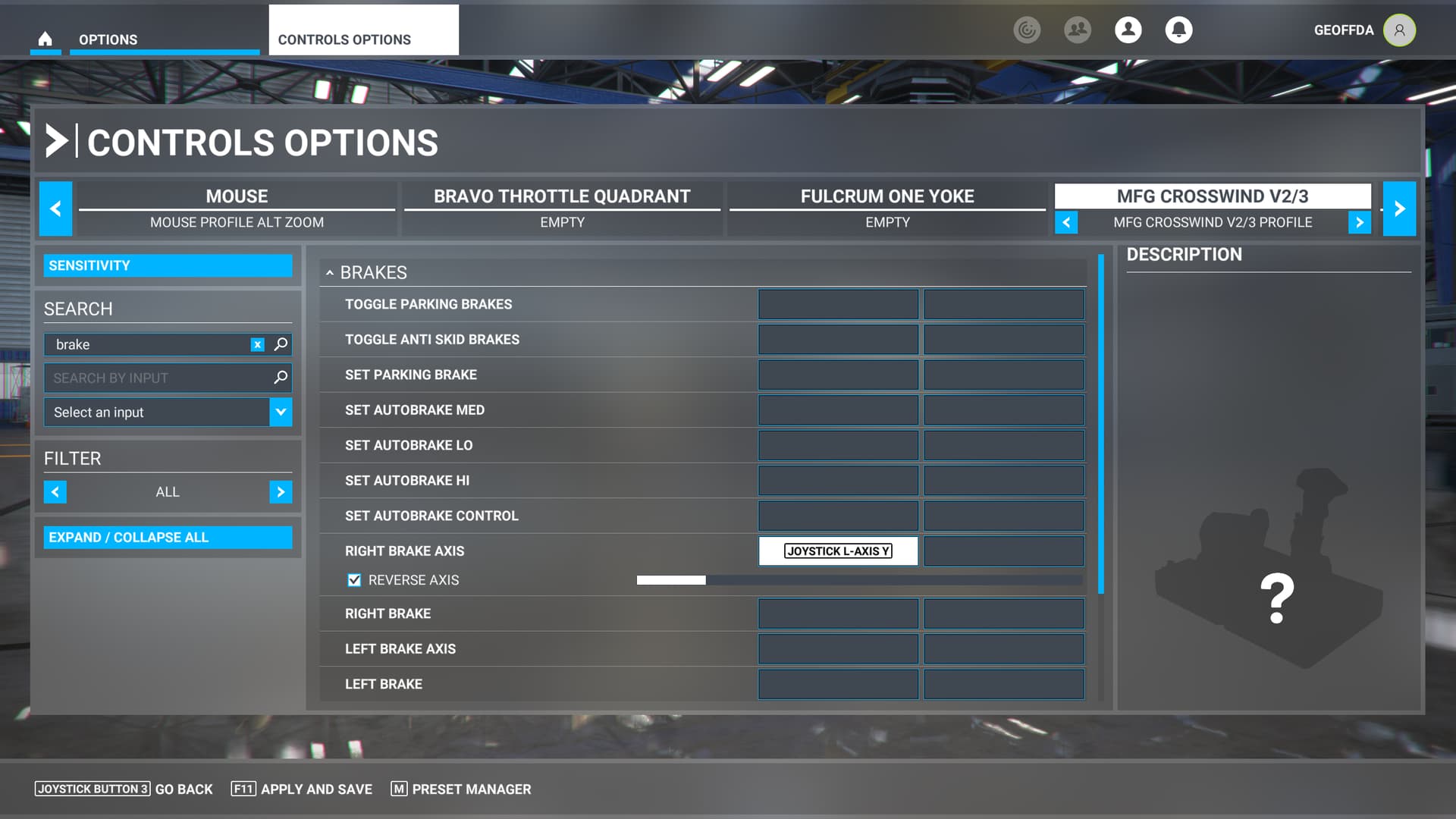 Lastly, make sure you are binding to the proper control axis and not to a button. In MSFS, it should look like this to bind the right brake axis to the Y axis on the MFG Crosswind pedals. I’m slightly pressing the right brake here.