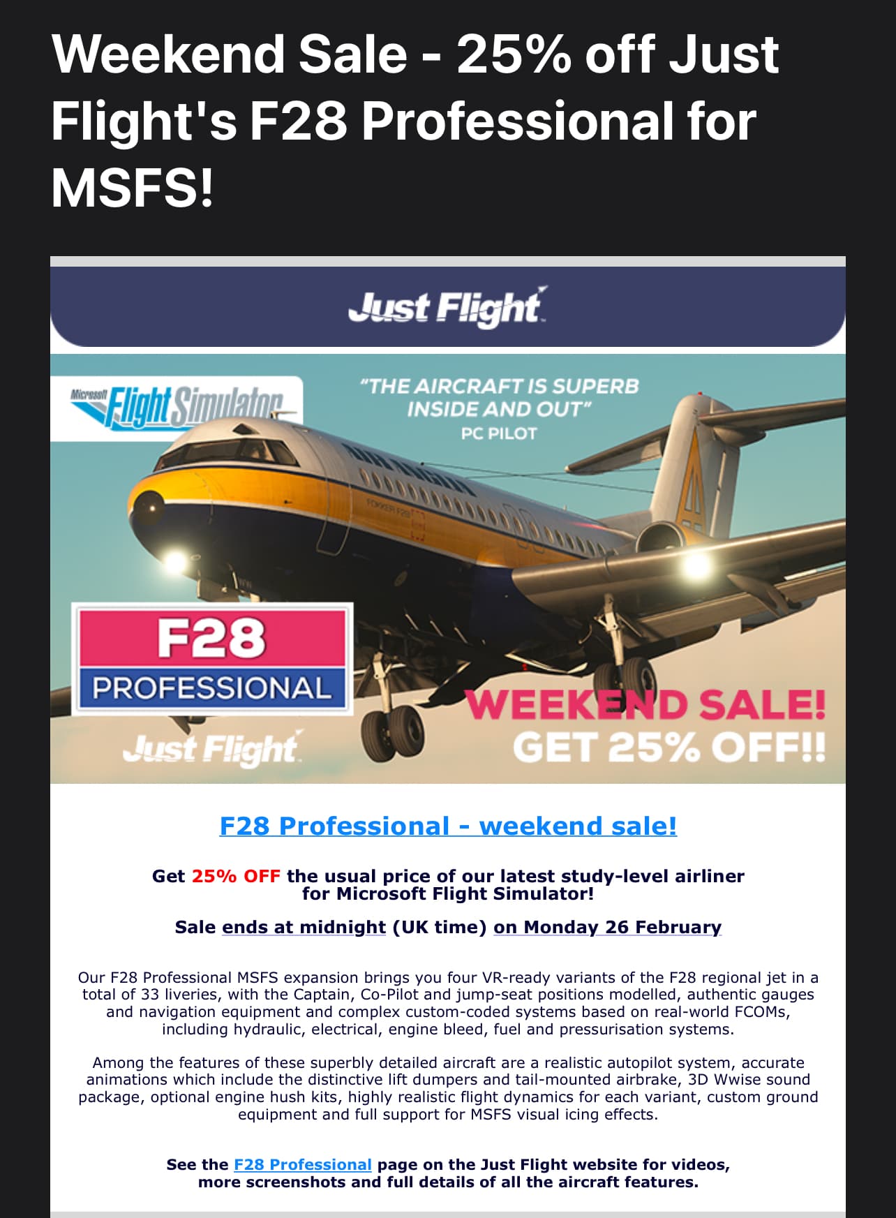 JF’s Fokker F28 on 25% sale this weekend apparently.