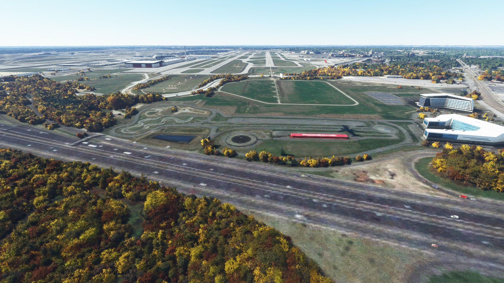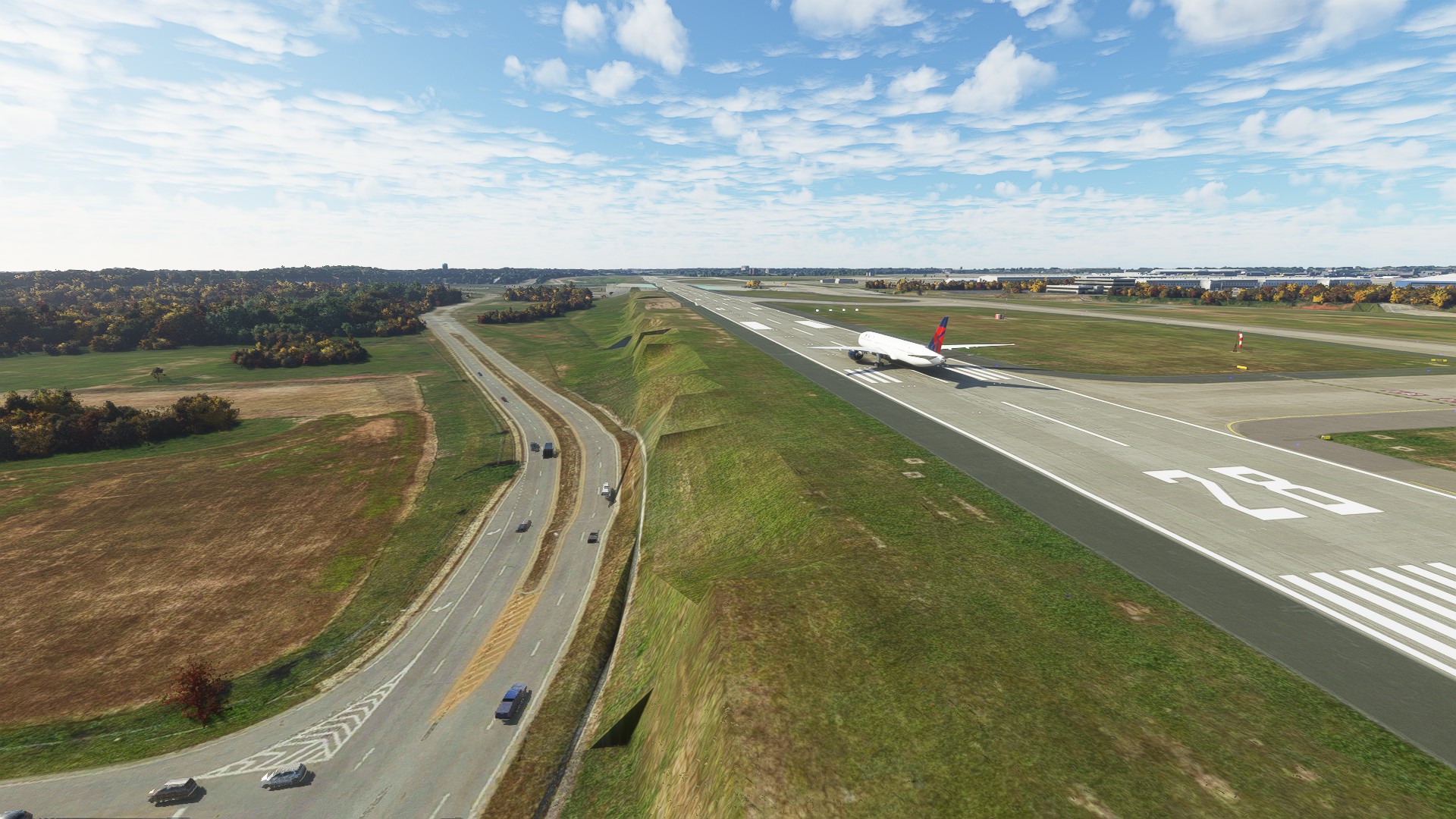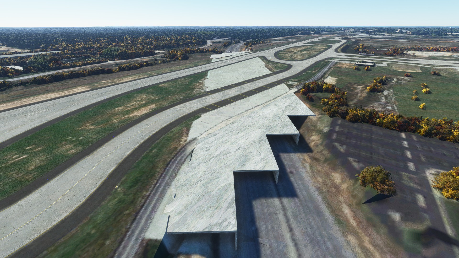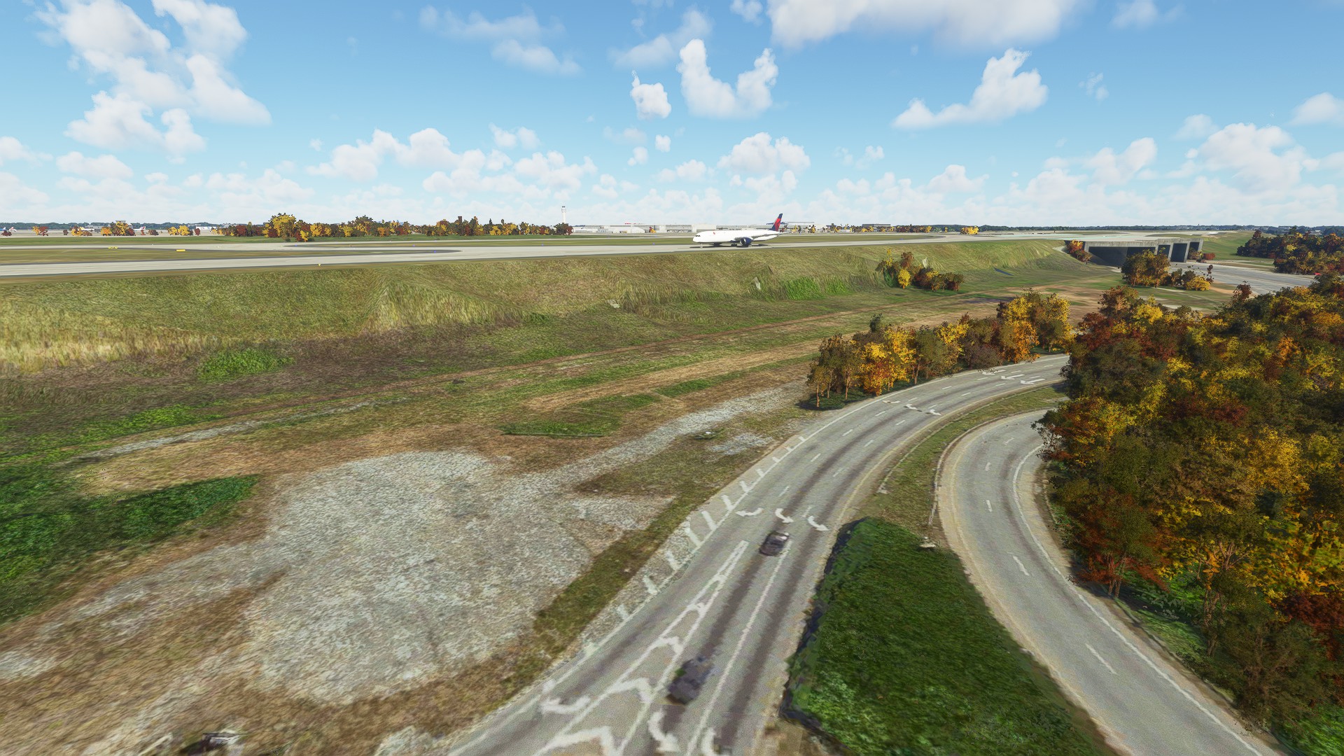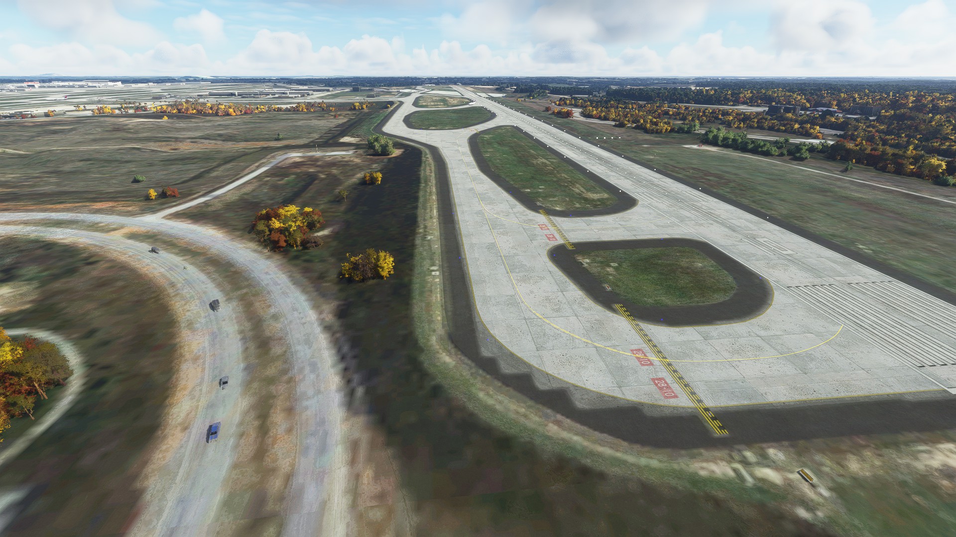 Runway 10/28 sits on a plateau in real life. The payware scenery doesn’t do a good job replicating this. It looks flat when compared to Forrest Parkway and Riverdale Road that goes around runway 10/28. The handcrafted version captures this better.