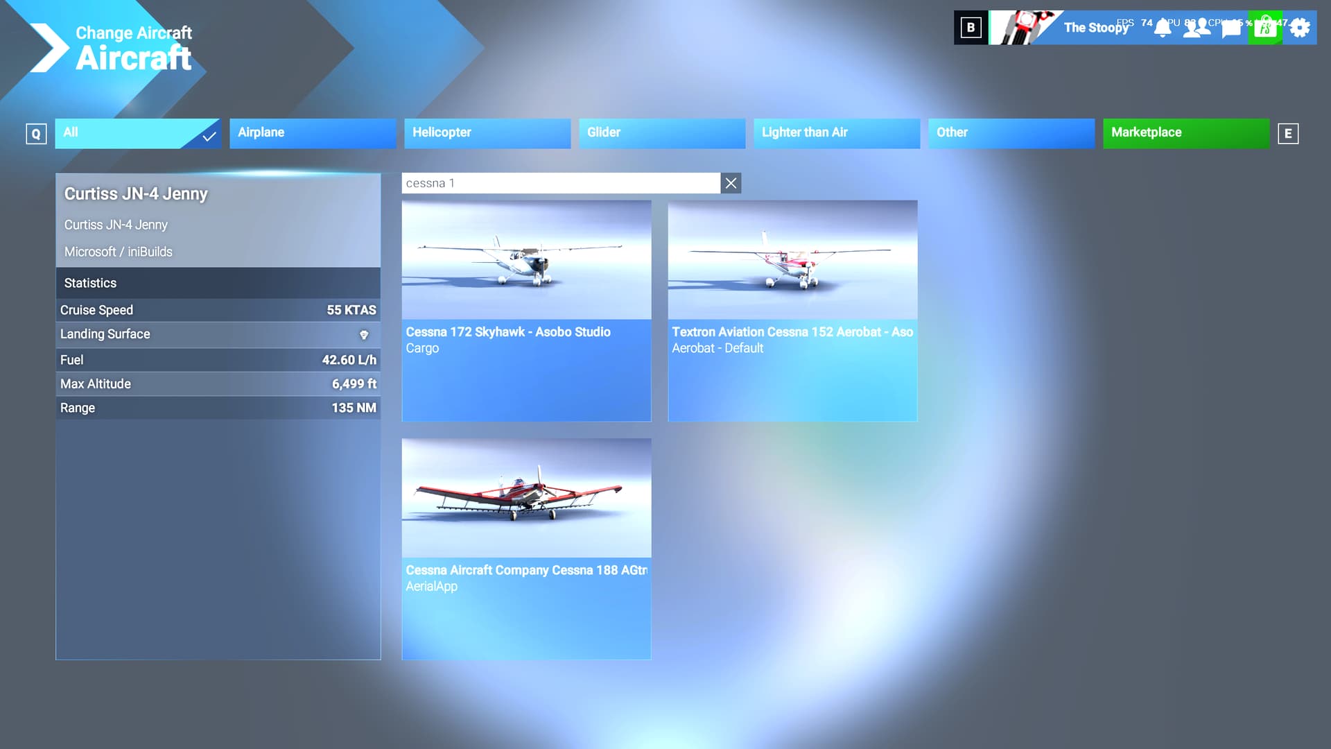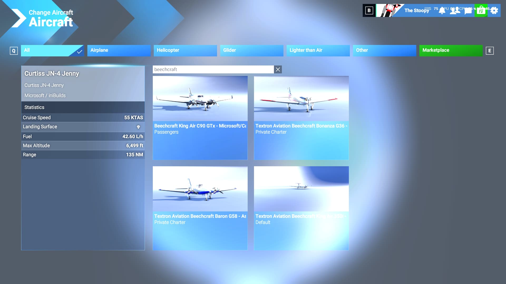 Example 2: Filtering the aircraft selection screen for “Beechcraft”, observe that only the default Beechcraft show up, missing the Beech 18, Beech Staggerwing and Beech V25 Bonanza from the Markeplace: