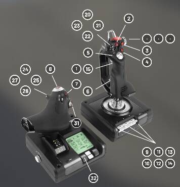 Secondly I recently have mapped the Elevator Trim Axis (-100 to 100%) to the small wheel (no 31) on the throttle handle, trying to emulate the trim wheel in real planes. This is way too sensitive, slight movements lurch the plane up and down but I use it as a ‘major’ trimmer to try to get some trim control, mainly in the outside view so that you can watch the trim indicator, usually a bit trim up. It is extremely sensitive though and induces rocket like climbs and dives which are not aeronautically sound. This is the R axis in the sim and over sensitivity could be a Saitek issue. I need to play around with the sensitivity settings on this. If I get it to work nicely will post a reply.