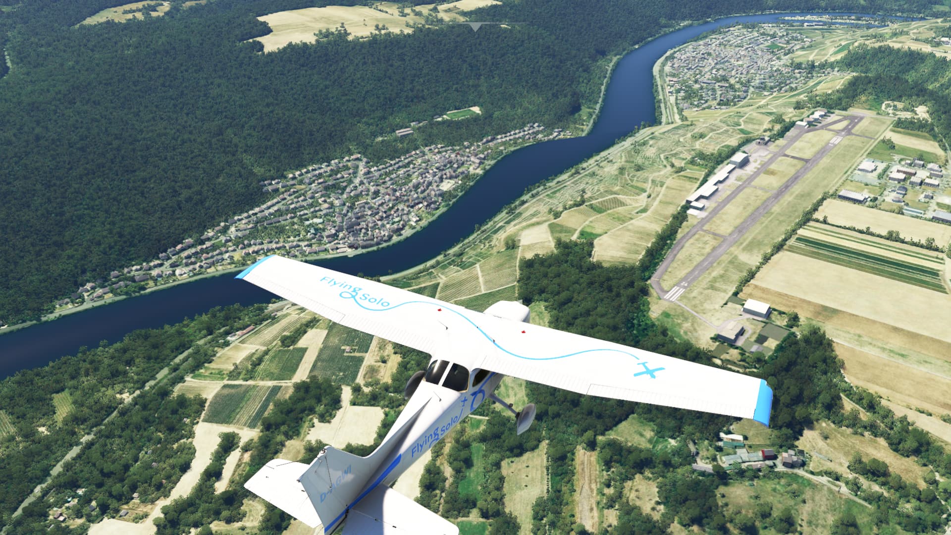 Scenery Germany EDRK. The river Mosel (near the Scenery Deutsches Eck) next to the EDRK airfield now goes up the mountain, almost to the height of the airfield. The airfield is on a mountain, the river in the valley.