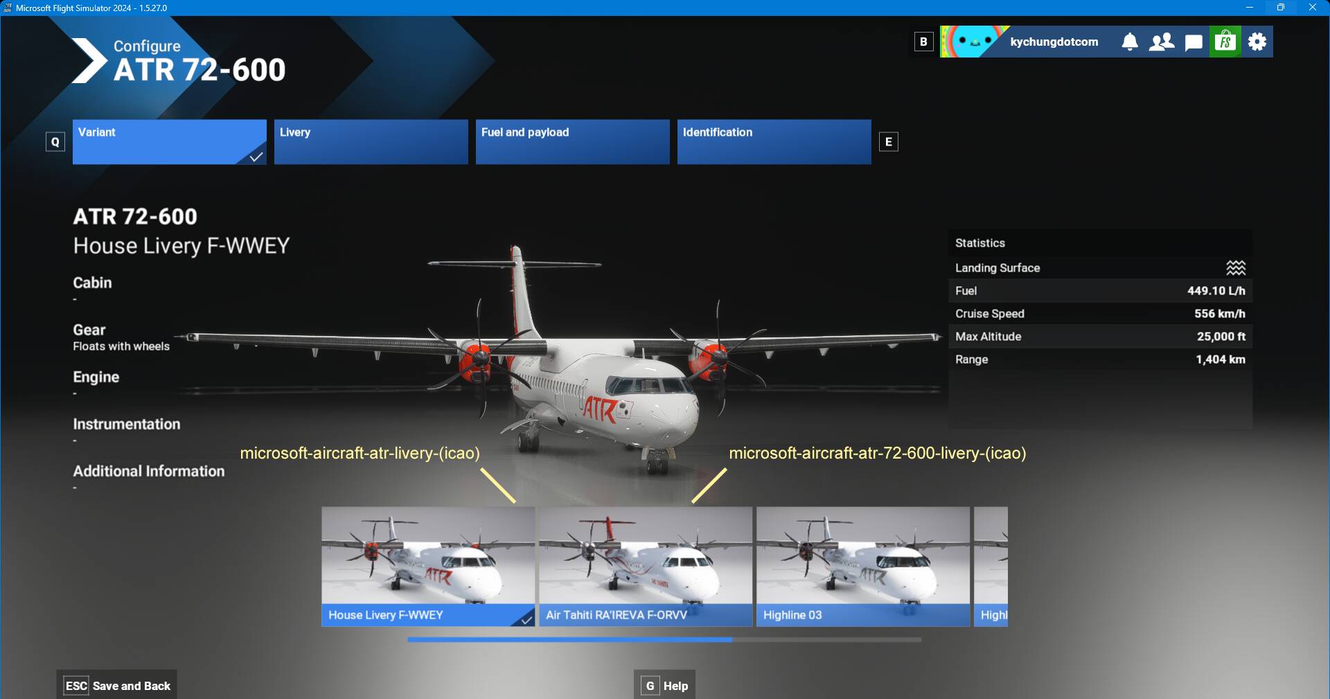 Things get more interesting when I use the same method to convert my ATR liveries. For ATR72, there are 2 variants, the first one is the House Livery where the second one is the Air Tahiti Livery. I don’t know the difference between them. However, if I rename the package name to be “microsoft-aircraft-atr-livery-(icao)“, it will become the “livery” of the House Livery variant. On the other hand, if I rename the package name to be “microsoft-aircraft-atr-72-600-livery-(icao)“, it will become the “livery” of the Air Tahiti variant.